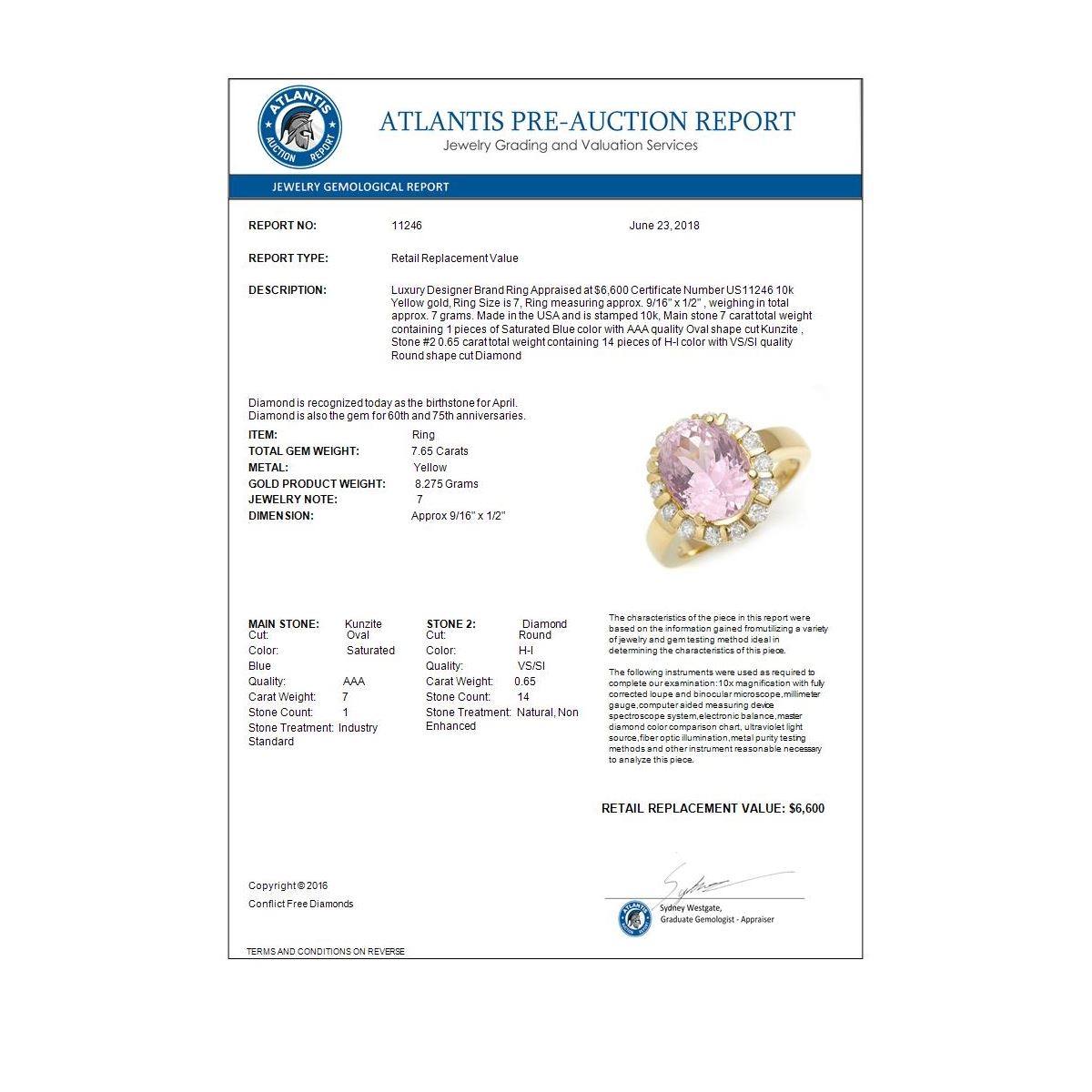REF-99H6A -11246 ---- 7.65 CTW Kunzite & Diamond Ring 10K Yellow Gold ---- Luxury Designer Brand Ring Appraised at $6,600 Certificate Number US11246 10k Yellow gold, Ring Size is 7, Ring measuring approx. 9/16" x 1/2" , weighing in total approx. 7 grams. Made in the USA and is stamped 10k, Main stone 7 carat total weight containing 1 pieces of Saturated Blue color with AAA quality Oval shape cut Kunzite , Stone #2 0.65 carat total weight containing 14 pieces of H-I color with VS/SI quality Round shape cut Diamond