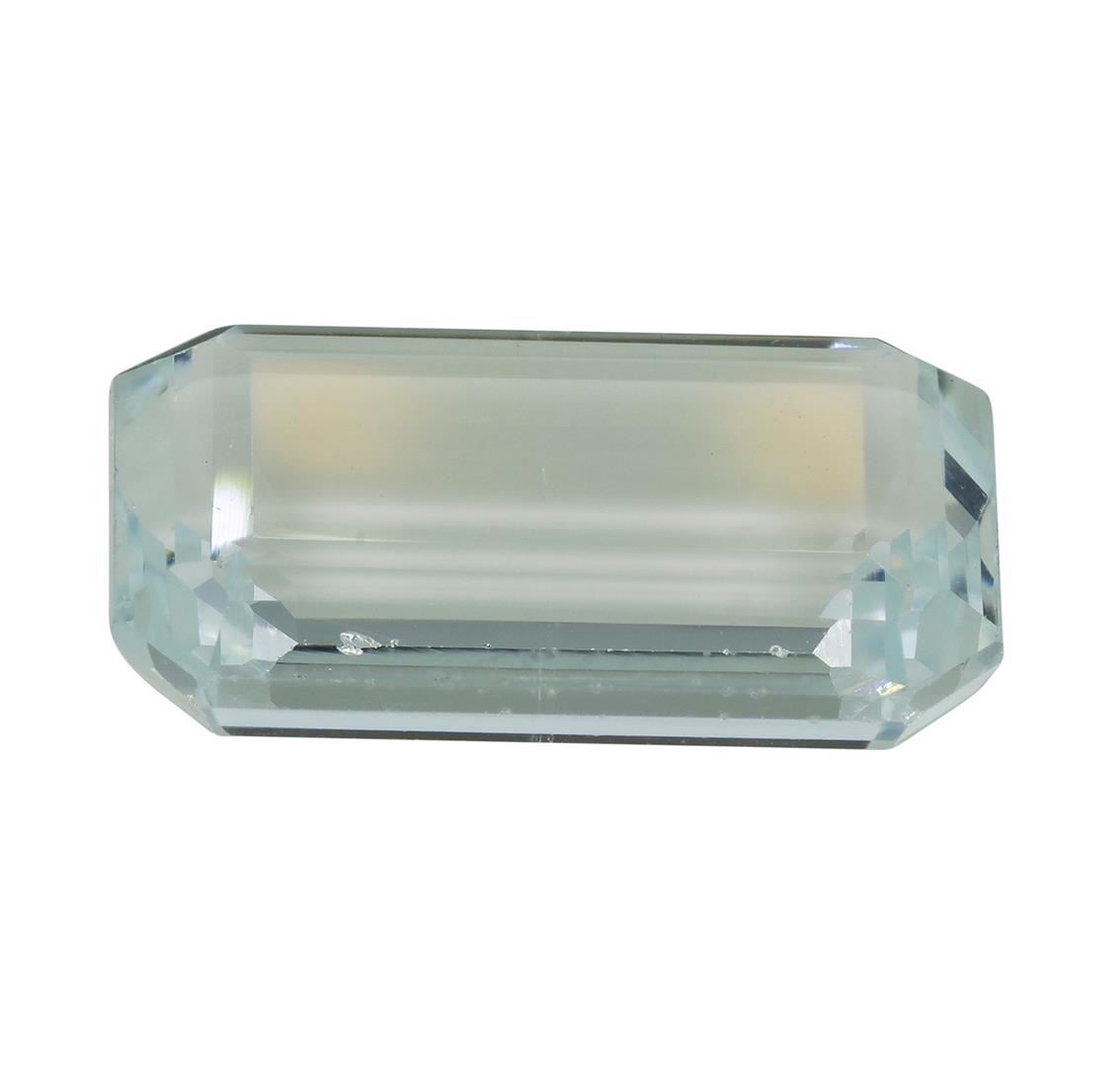 One natural emerald cut aquamarine with an exact weight of 7.65ct., clarity is eye clean, slightly grayish greenish blue, light. Gemological Appraisals Services estimates the retail value at $2180.25 GAS Appraised.