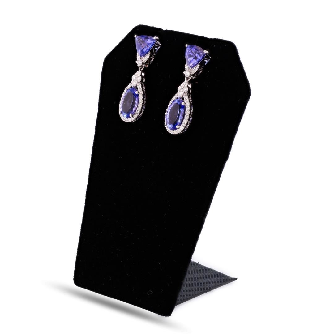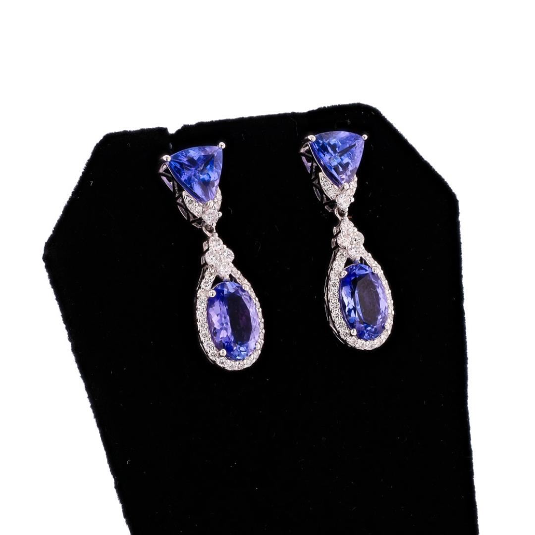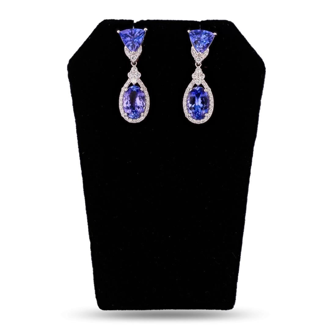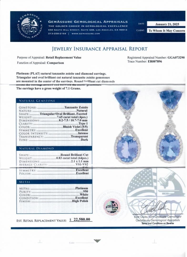 Platinum (PLAT) natural tanzanite zoisite and diamond earrings. Triangular and oval brilliant cut natural tanzanite zoisite gemstones are mounted in the center of the earrings. Round brilliant cut diamonds accent the earrings around and between the center gemstones. The earrings have a gross weight of 7.1 Grams. #NATURAL GEMSTONE# GEMSTONE: Tanzanite Zoisite; NATURE: Natural; SHAPE: Triangular/Oval Brilliant, Faceted; WEIGHT: 7.65 carat total (4pcs.); DIMENSIONS: 8.2 - 7.5 / 10.7 - 7.0mm; CLARITY: Type 1; COLOR: Bluish Violet (5/5); SYMMETRY: Excellent; COLOR INTENSITY: Intense; TRANSPARENCY: Transparent; TONE: Dark #NATURAL DIAMOND# SHAPE: Round Brilliant Cut; WEIGHT: 0.83 carat total (64pcs.); DIMENSIONS: 2.1 x 1.1mm; AVERAGE CLARITY: VS1-VS2; AVERAGE COLOR: F-G; SYMMETRY: Excellent; POLISH: Excellent #METAL# METAL: Platinum; PURITY: 950; COLOR: White; CONDITION: Excellent; FINISH: High Polish