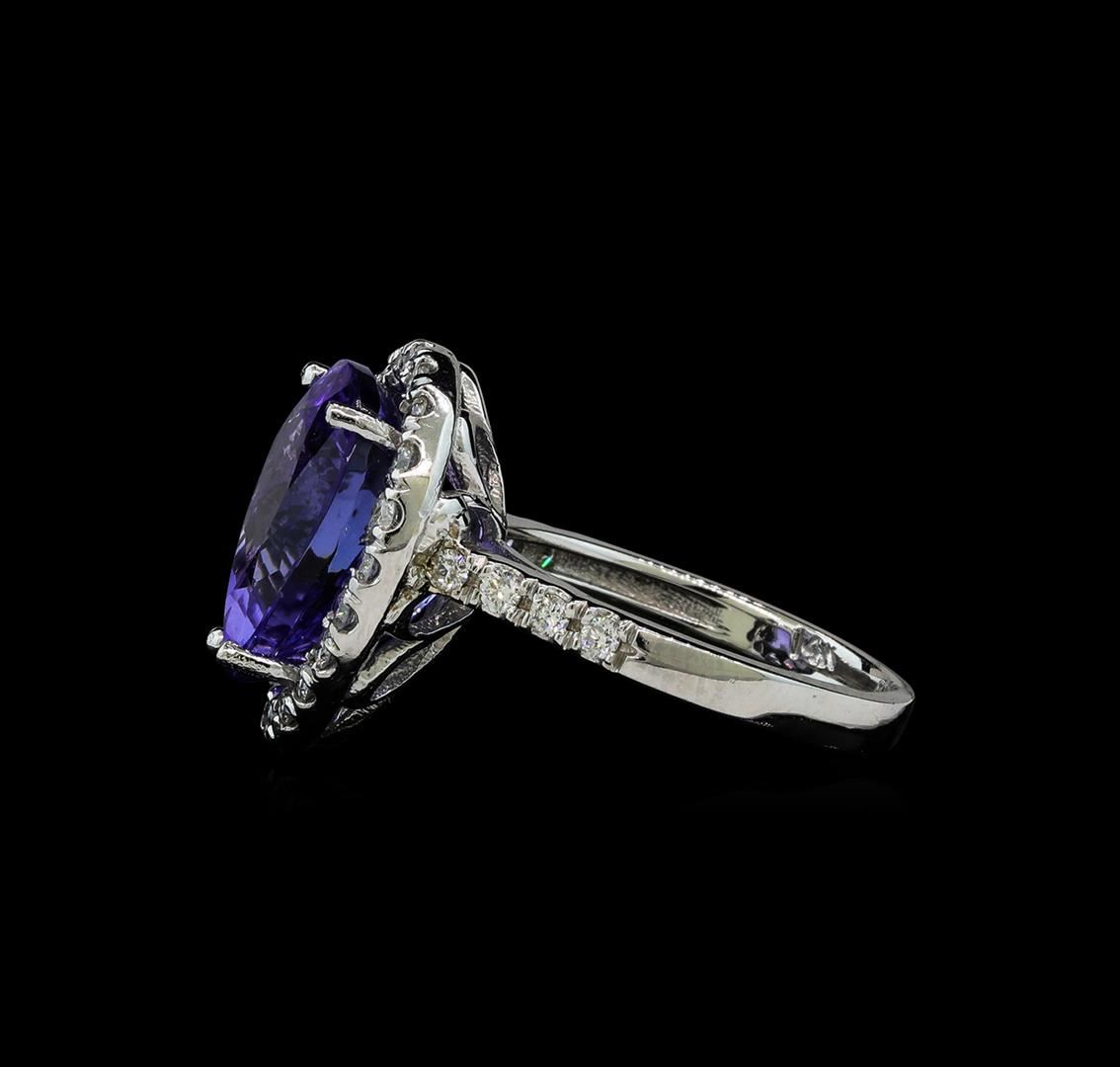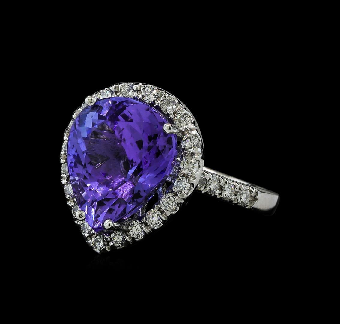 One electronically tested 14KT white gold lady's cast fashion ring with a cathedral shank with a basket halo with a bright polish finish. The featured lady's ring has a shank measuring 2.31 millimeters wide. Identified with markings of '14K'. Condition is new, good workmanship. Containing: One prong set pear modified brilliant cut natural tanzanite, measuring 13.27 x 11.18 x 7.83mm, (depth est.) approximate weight of 7.65ct., clarity is eye clean, medium light, moderately strong, violet color, (GIA V 4/4), cut is very good. Transmitting light with no distortion, transparent. Colored gemstones are presumed to have been subjected to commonly used enhancement processes. Graded in the setting. Twenty-Eight prong set round brilliant cut diamonds, measuring 1.80 - 1.70 x 1.05mm (depth est.) approximate total weight of 28 Stones = 0.55ct. Graded in the setting. Clarity SI-1 to I-1. Color: H - I Cut Good. Total Weight of Colored Stones 7.65ct.. Total Weight of Diamonds 0.55ct.. Total Weight of Ring 6.30gm GAS Appraised at $10,965.00.