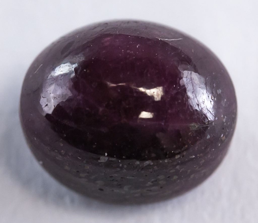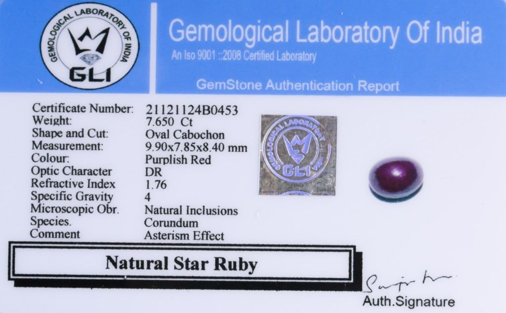 7.65 ct oval cabochon purplish red natural star ruby. Accompanied with GLI certificate. 9.90 x 7.85 x 8.40 mm.