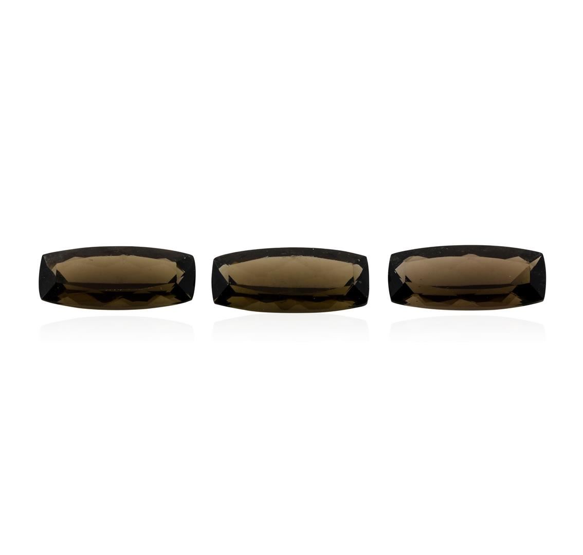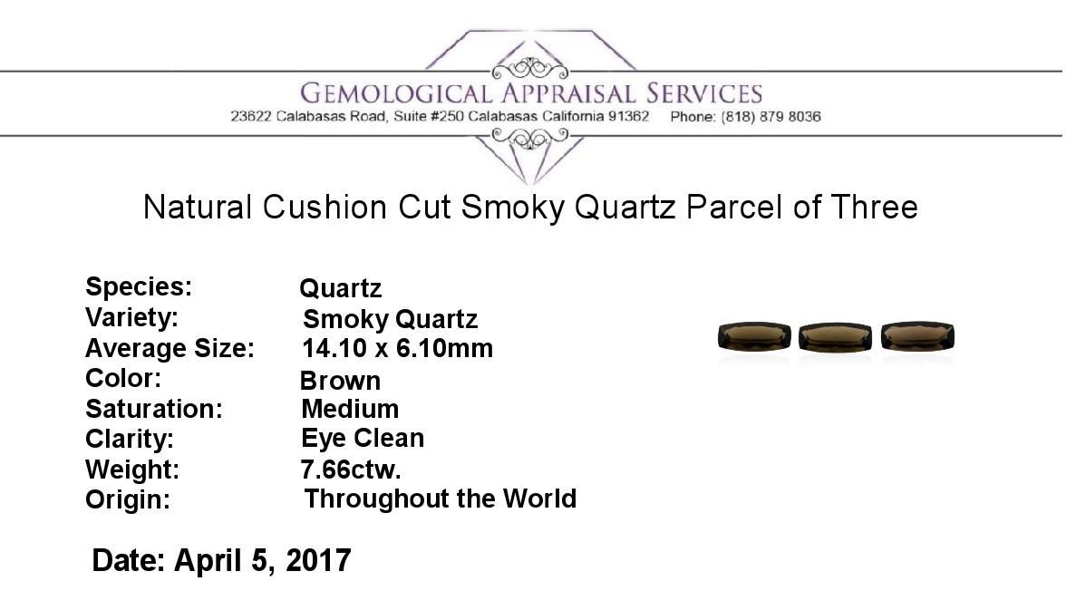 One natural cushion cut smoky quartz parcel of three with an exact weight of 7.66ctw., clarity is eye clean, brown, medium. Gemological Appraisals Services estimates the retail value at $137.88 GAS Appraised.