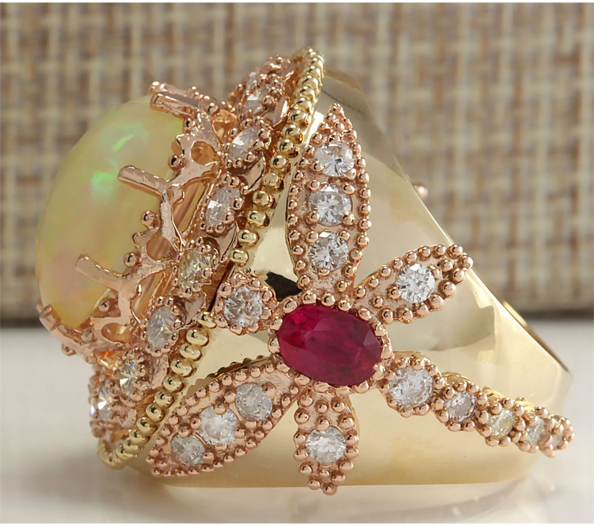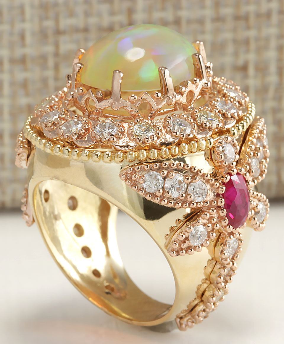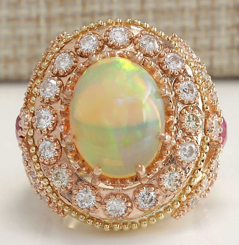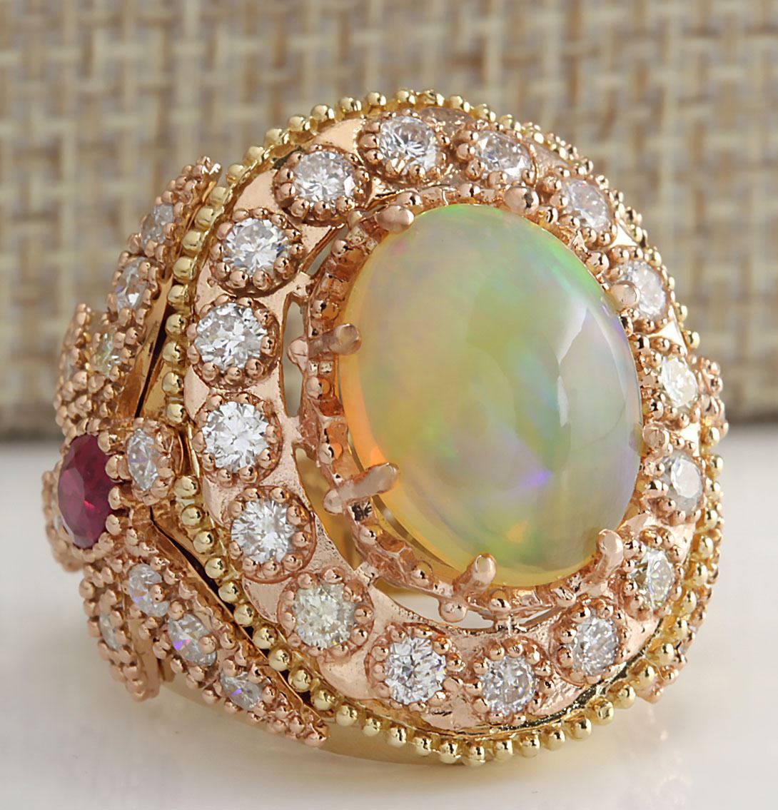 Stamped: 14K Ring Size: 7 Total Ring Weight: 17.7 Grams Diamond Weight: Total natural diamond weight is 2.65carat. SI1-SI2 clarity / G-H color Gemstone Weight: Total Natural Opal Weight is 3.82ctw (Measures: 14.79x11.66mm) Side ruby weight is 1.24ctw Face Measures: 26.50x23.60mm SKU: [704156]