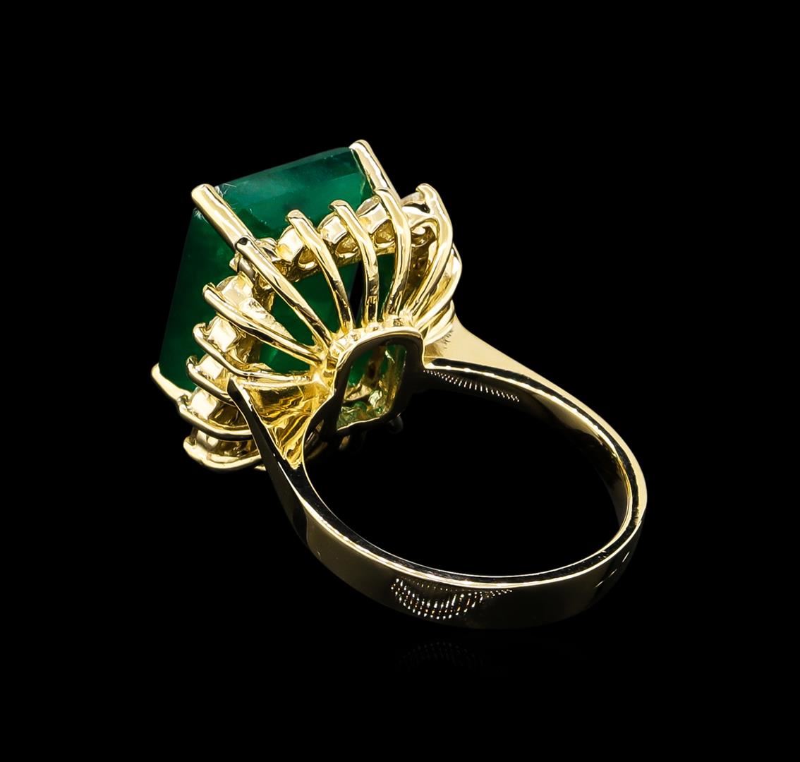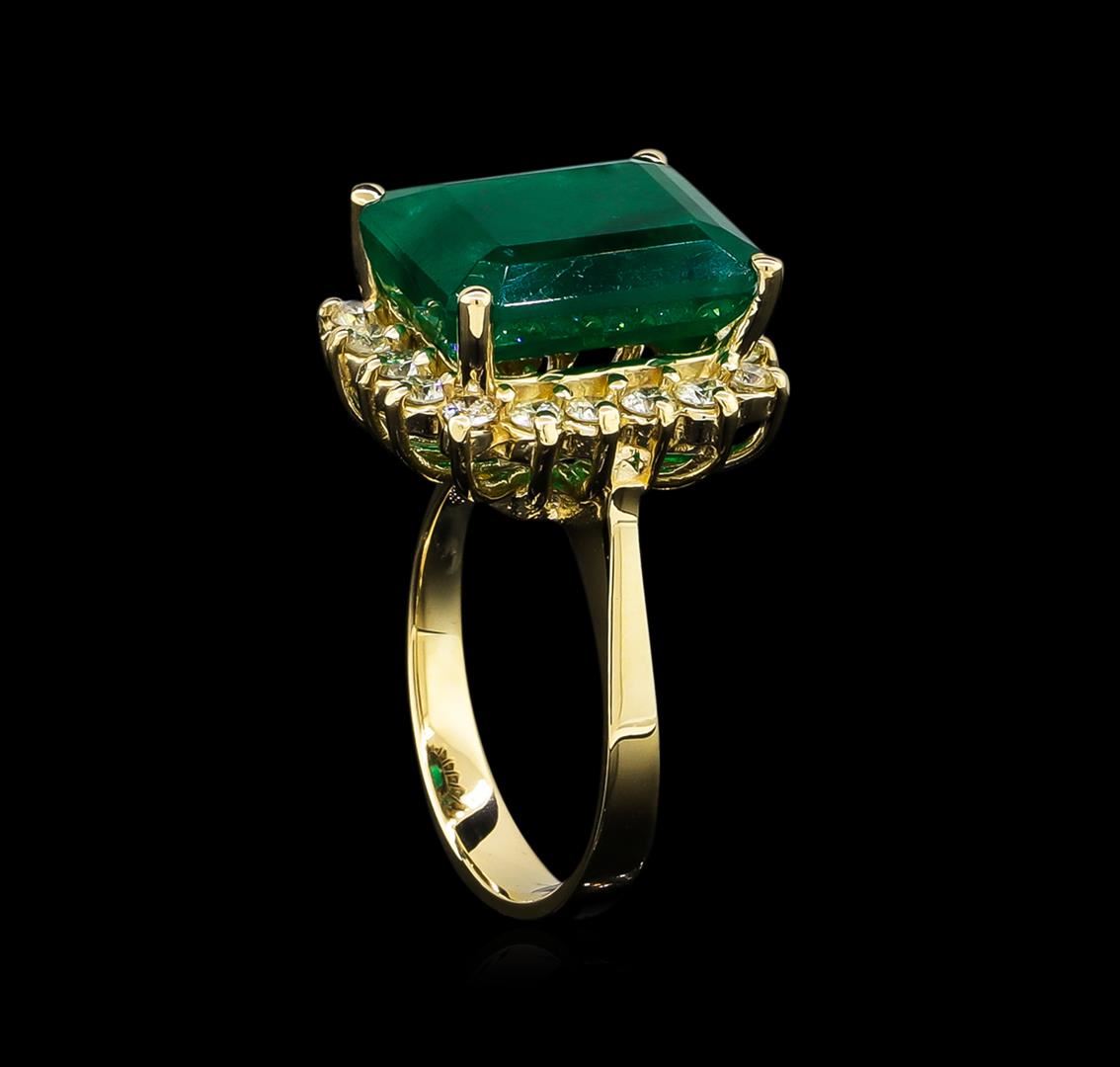 One electronically tested 14KT yellow gold lady's cast fashion ring with a basket halo with a bright polish finish. The featured lady's ring has a shank measuring 3.07 millimeters wide. Identified with markings of "14K". Condition is new, good workmanship. Containing: One prong set emerald step cut natural emerald, measuring 13.32 x 10.85 x 6.32mm, 14%. bulge factor, approximate weight of 7.71ct., clarity is heavily included, type III, medium dark, moderately strong, green color, (GIA G 6/4), cut is very good. Transmitting light somewhat diffusely, semi-transparent to translucent. Naturally occurring internal & external characteristics are present. Indications of oil residue. Graded in the setting. Eighteen prong set round brilliant cut diamonds, measuring 2.10 - 2.00 x 1.27mm (depth est.) approximate total weight of 18 Stones = 0.60ct. Graded in the setting. Clarity: VS-2 to SI-1. Color: H - I. Cut Good. Total Weight of Colored Stones 7.71ct. Total Weight of Diamonds 0.60ct. Total Weight of Ring 7.20gm. GAS Appraised at $17,270.00.