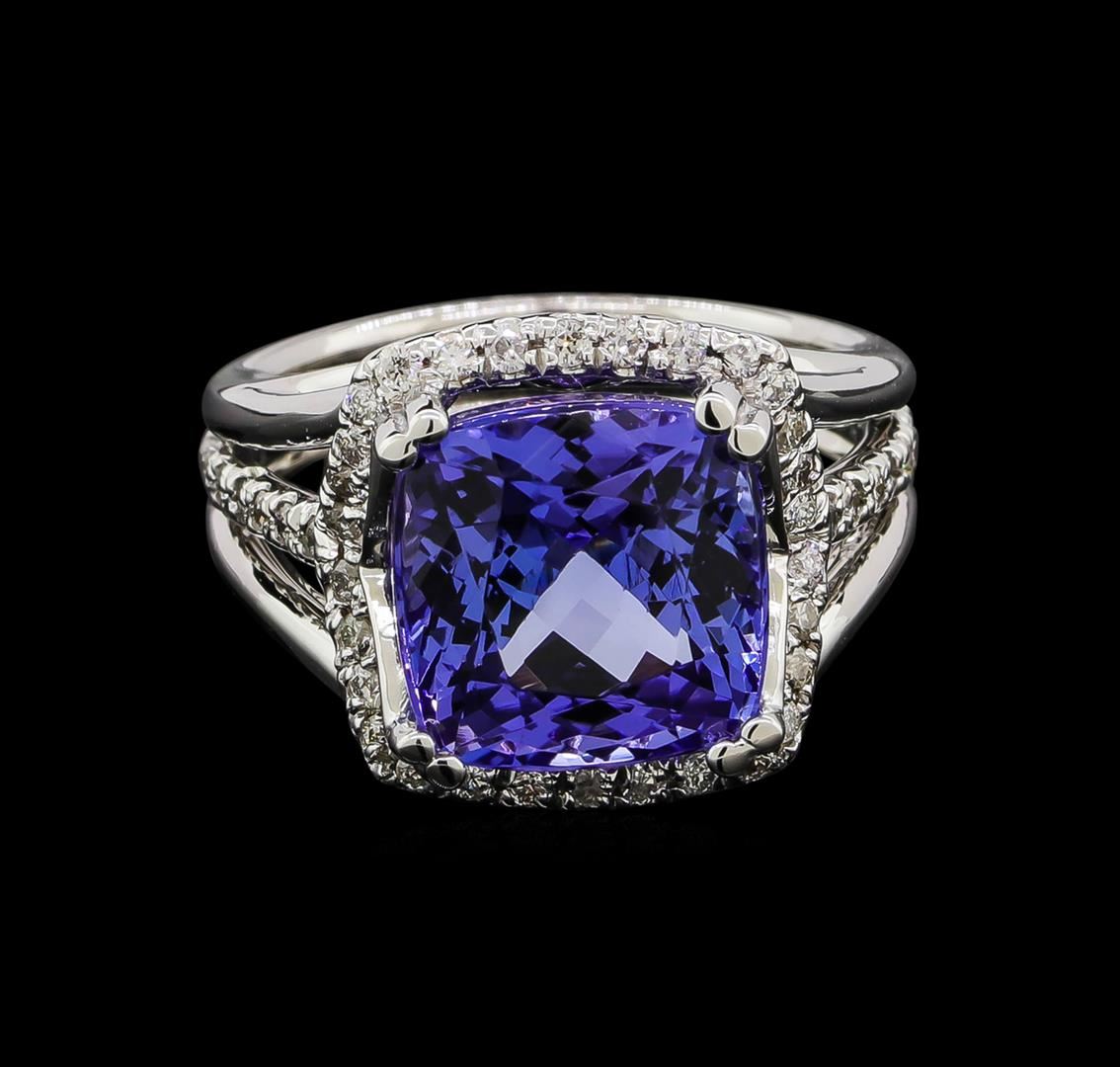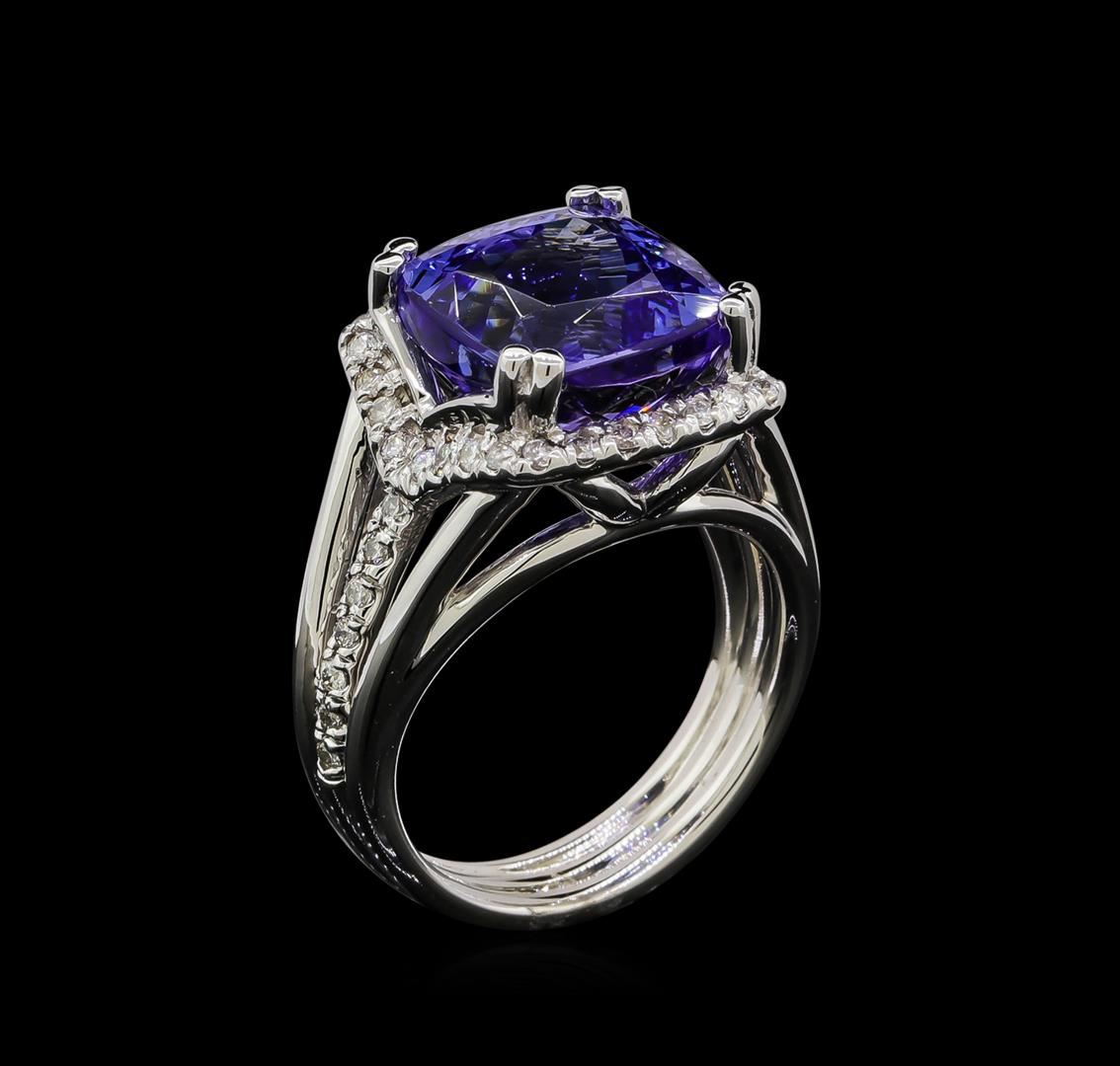 One electronically tested 14KT white gold lady's cast fashion ring with a triple split shank with a bright polish finish. The featured lady's ring has a triple shank measuring 4.40 millimeters wide. Identified with markings of '14K'. Condition is new, good workmanship. Containing: One prong set square cushion modified brilliant cut natural tanzanite, measuring 10.53 x 10.51 x 8.07mm, (depth est.) 10%. bulge factor, approximate weight of 7.71ct., clarity is eye clean, medium, very slightly grayish, violetish blue color, (GIA vB 5/3), cut is very good. Transmitting light with no distortion, transparent. Colored gemstones are presumed to have been subjected to commonly used enhancement processes. Graded in the setting. Forty-Two prong set round brilliant cut diamonds, measuring 1.40 - 1.35 x 0.86mm (depth est.) approximate total weight of 42 Stones = 0.42ct. Graded in the setting. Clarity SI-1 to SI-2. Color: H - I Cut Good. Total Weight of Colored Stones 7.71ct.. Total Weight of Diamonds 0.42ct.. Total Weight of Ring 9.30gm GAS Appraised at $14,510.00.