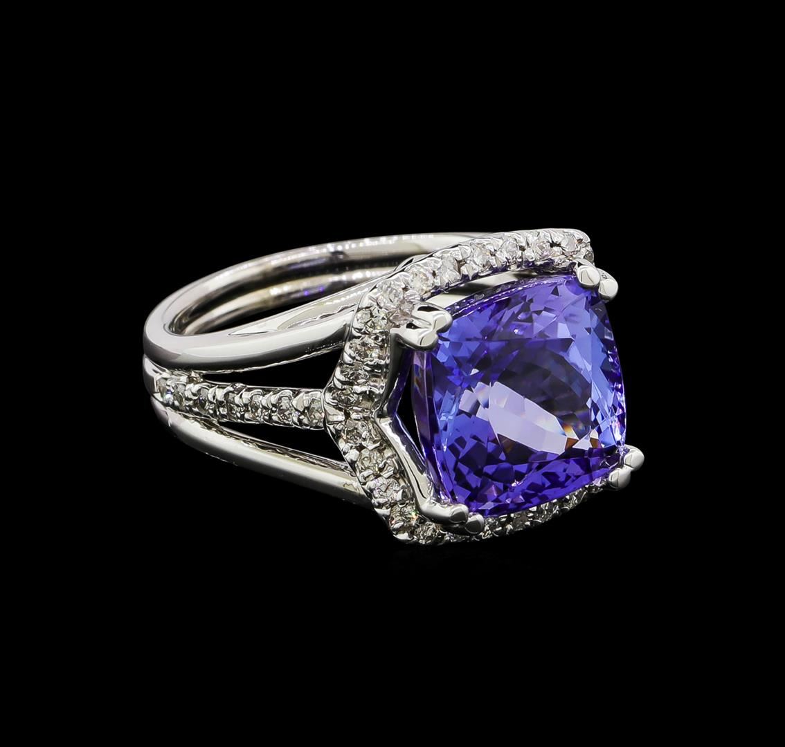 One electronically tested 14KT white gold lady's cast fashion ring with a triple split shank with a bright polish finish. The featured lady's ring has a triple shank measuring 4.40 millimeters wide. Identified with markings of '14K'. Condition is new, good workmanship. Containing: One prong set square cushion modified brilliant cut natural tanzanite, measuring 10.53 x 10.51 x 8.07mm, (depth est.) 10%. bulge factor, approximate weight of 7.71ct., clarity is eye clean, medium, very slightly grayish, violetish blue color, (GIA vB 5/3), cut is very good. Transmitting light with no distortion, transparent. Colored gemstones are presumed to have been subjected to commonly used enhancement processes. Graded in the setting. Forty-Two prong set round brilliant cut diamonds, measuring 1.40 - 1.35 x 0.86mm (depth est.) approximate total weight of 42 Stones = 0.42ct. Graded in the setting. Clarity SI-1 to SI-2. Color: H - I Cut Good. Total Weight of Colored Stones 7.71ct.. Total Weight of Diamonds 0.42ct.. Total Weight of Ring 9.30gm GAS Appraised at $14,510.00.