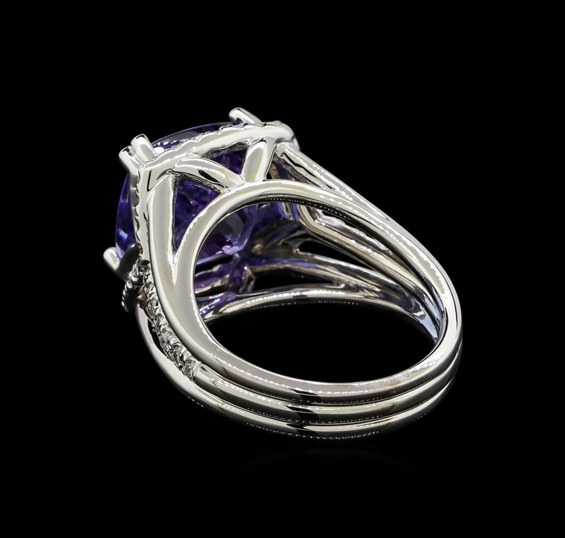 One electronically tested 14KT white gold lady's cast fashion ring with a triple split shank with a bright polish finish. The featured lady's ring has a triple shank measuring 4.40 millimeters wide. Identified with markings of '14K'. Condition is new, good workmanship. Containing: One prong set square cushion modified brilliant cut natural tanzanite, measuring 10.53 x 10.51 x 8.07mm, (depth est.) 10%. bulge factor, approximate weight of 7.71ct., clarity is eye clean, medium, very slightly grayish, violetish blue color, (GIA vB 5/3), cut is very good. Transmitting light with no distortion, transparent. Colored gemstones are presumed to have been subjected to commonly used enhancement processes. Graded in the setting. Forty-Two prong set round brilliant cut diamonds, measuring 1.40 - 1.35 x 0.86mm (depth est.) approximate total weight of 42 Stones = 0.42ct. Graded in the setting. Clarity SI-1 to SI-2. Color: H - I Cut Good. Total Weight of Colored Stones 7.71ct.. Total Weight of Diamonds 0.42ct.. Total Weight of Ring 9.30gm GAS Appraised at $14,510.00.