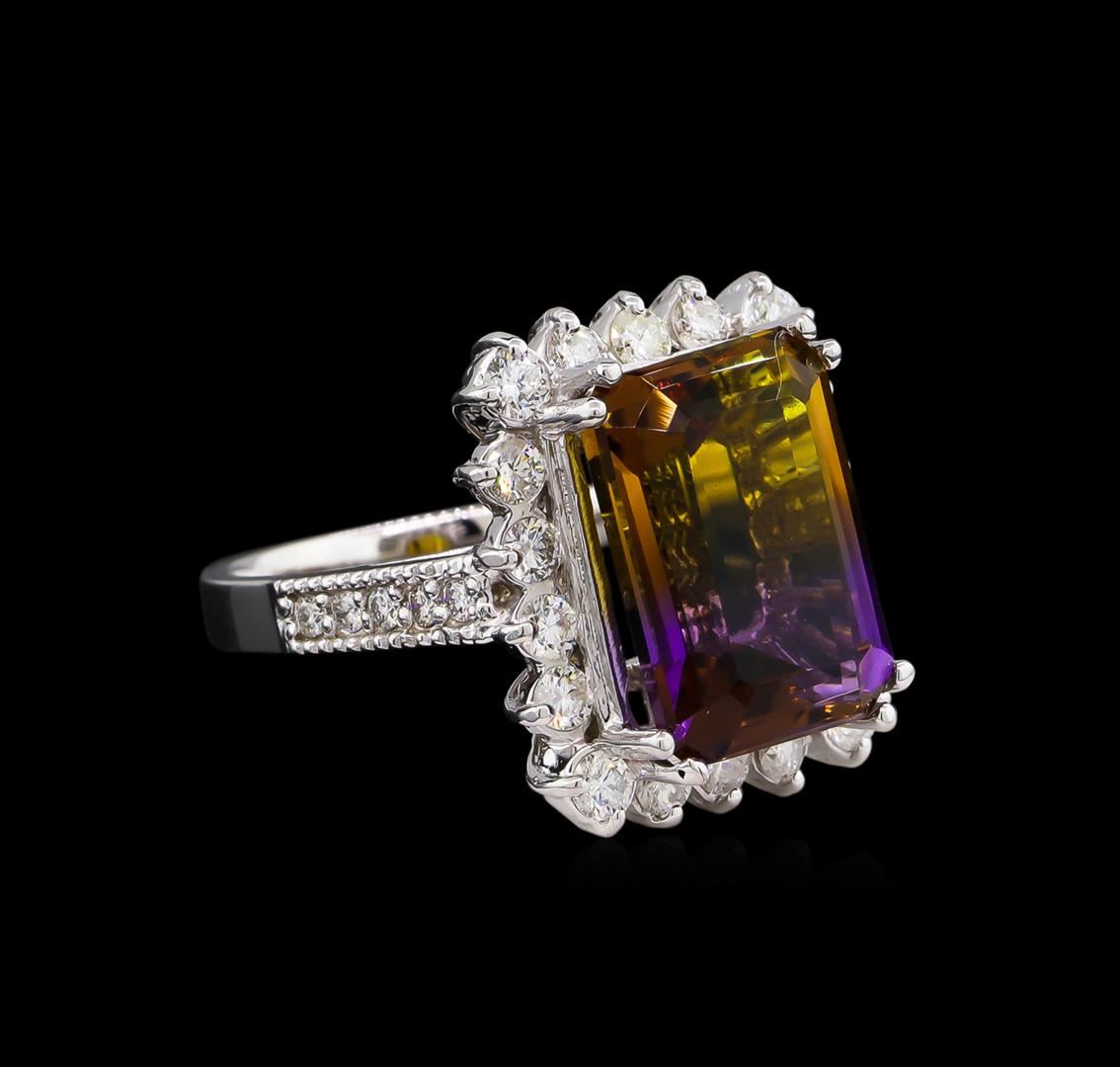 One electronically tested 14KT white gold lady's cast fashion ring with a cathedral shank with a basket halo with a bright polish with milgrain detailing finish. The featured lady's ring has a shank measuring 2.34 millimeters wide. Identified with markings of "K14". Condition is new, good workmanship. Containing: One prong set emerald step cut natural ametrine quartz, measuring 14.15 x 10.25 x 6.90mm, 7%. bulge factor, approximate weight of 7.72ct., clarity is eye clean, type I, medium dark, moderately strong, purple color, (GIA P 6/4) to medium dark, moderately strong, orangy yellow, (GIA oY 6/4), cut is good. Transmitting light with no distortion, transparent. Colored gemstones are presumed to have been subjected to commonly used enhancement processes. Graded in the setting. Four prong set round brilliant cut diamonds, measuring 2.60 - 2.50 x 1.53mm (depth est.) approximate total weight of 4 Stones = 0.24ct. Graded in the setting. Clarity: SI-1 to SI-2. Color: G - Good Fourteen prong set round brilliant cut diamonds, measuring 2.35 - 2.25 x 1.43mm (depth est.) approximate total weight of 14 Stones = 0.65ct. Graded in the setting. Clarity: SI-1 to I-1. Color: G - Good Ten prong set round brilliant cut diamonds, measuring 1.55 - 1.50 x 0.92mm (depth est.) approximate total weight of 10 Stones = 0.13ct. Graded in the setting. Clarity: SI-1 to SI-2. Color: G - I. Cut Good. Total Weight of Colored Stones 7.72ct. Total Weight of Diamonds 1.02ct. Total Weight of Ring 8.60gm GAS Appraised.