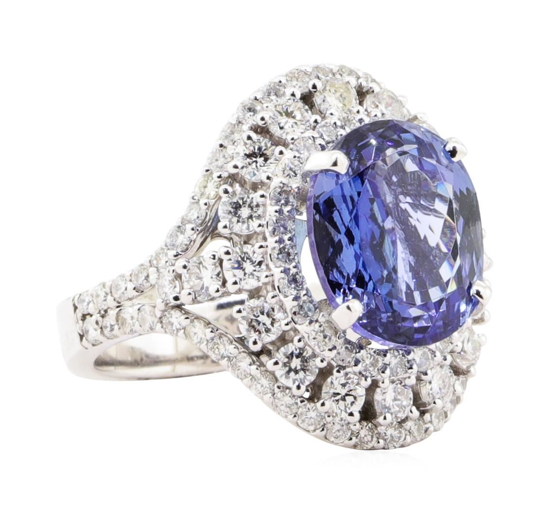 One electronically tested 14KT white gold lady's cast fashion ring with a bright polish finish. The featured lady's ring has a 3.70 millimeter wide shank. Identified with markings of 'K14'. Condition is new, good workmanship. Containing: One prong set oval mixed cut natural tanzanite, measuring 11.69 x 9.56 x 6.40mm, (depth est.) 18%. bulge factor, approximate weight of 5.96ct., clarity is eye clean, medium dark, moderately strong, bluish violet color, (GIA bV 6/4), cut is very good. Colored gemstones are presumed to have been subjected to commonly used enhancement processes. Graded in the setting. Seventy-Eight shared prong set round brilliant cut diamonds, measuring 1.45 - 1.40 x 0.89mm (depth est.) approximate total weight of 78 Stones = 0.87ct. Graded in the setting. Color H - I Clarity SI-1 to I-1 Cut Good Eighteen prong set round brilliant cut diamonds, measuring 2.30 - 2.25 x 1.48mm (depth est.) approximate total weight of 18 Stones = 0.86ct. Graded in the setting. Color H - I Clarity SI-1 to SI-2 Cut Good Two prong set round brilliant cut diamonds, measuring 1.55 - 1.55 x 1.01mm (depth est.) approximate total weight of 2 Stones = 0.03ct. Graded in the setting. Color H - I Clarity SI-1 to SI-2 Cut Good. Total Weight of Colored Stones 5.96ct.. Total Weight of Diamonds 1.76ct.. Total Weight of Ring 8.90gm GAS Appraised at $13985.00. GAS Appraised.