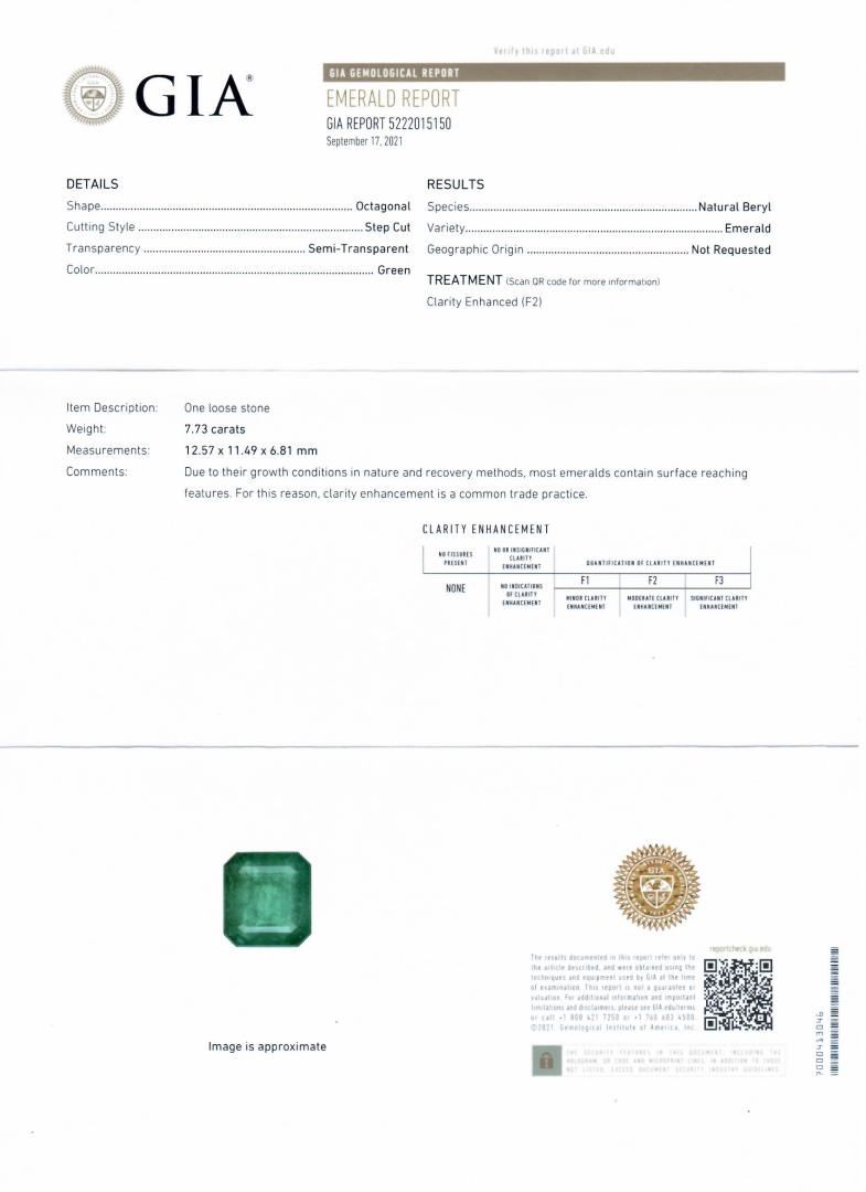 Description: One 18K Yellow Gold Emerald & Diamond Ring. Weighing 12.57 grams. #Containing:# One Octagonal Step Cut Natural Emerald GIA Report Number: 5222015150 Measurements: 12.57 x 11.49 x 6.81mm Weight: 7.73 carats Color: Green Transparency: Semi-Transparent Treatment: Moderate (F2) Eighteen round brilliant cut diamonds in prong set Total Weight: 1.65 carats Average Color: G Average Clarity: VS2-SI2 Size: 6 1/2