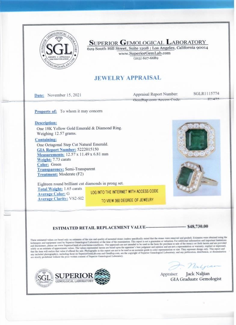 Description: One 18K Yellow Gold Emerald & Diamond Ring. Weighing 12.57 grams. #Containing:# One Octagonal Step Cut Natural Emerald GIA Report Number: 5222015150 Measurements: 12.57 x 11.49 x 6.81mm Weight: 7.73 carats Color: Green Transparency: Semi-Transparent Treatment: Moderate (F2) Eighteen round brilliant cut diamonds in prong set Total Weight: 1.65 carats Average Color: G Average Clarity: VS2-SI2 Size: 6 1/2