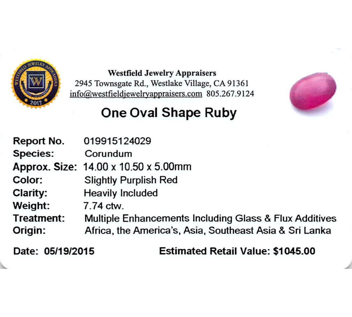One oval mixed cut natural ruby, measuring 14.00 x 10.50 x 5.00mm, exact weight 7.74ct., clarity is heavily included, type II, medium dark, very slightly brownish, slightly purplish red color, (GIA slpR 6/3), cut is good. Transmitting light somewhat diffusely, translucent. Naturally occurring internal & external characteristics are present. Indications of laboratory high temperature heat treatment, with glass & flux additives. Ruby has a low tolerance to rhodium plating, repolishing the surface, & ultrasonic cleaning. Westfield Appraised at $1,045.00.