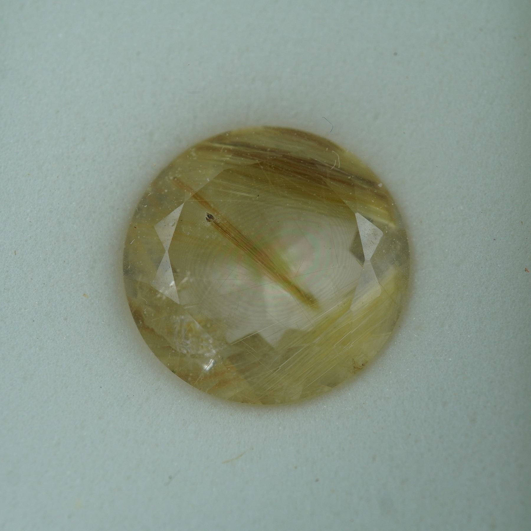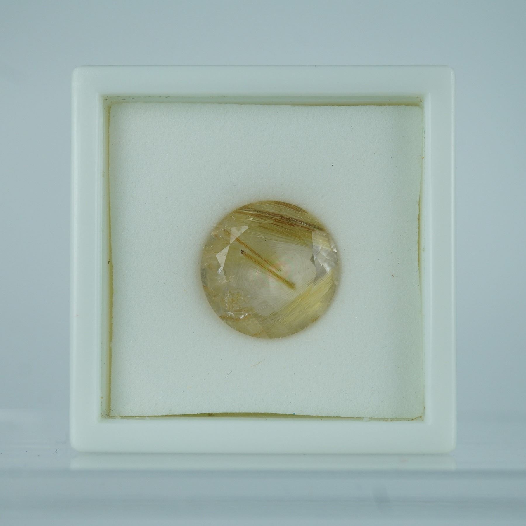 Round-cut rutilated quartz featuring golden needle-like inclusions naturally embedded within the transparent stone. These rutile threads create a striking internal texture and enhance the visual interest of the gem. Weight is approximately 7.75 carats. Comes with a protective case.
