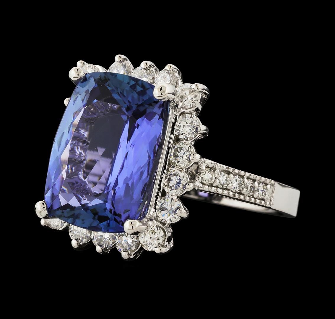 One electronically tested 14KT white gold lady's cast fashion ring with a cathedral shank with a basket halo with a bright polish with milgrain detailing finish. The featured lady's ring has a shank measuring 2.10 millimeters wide. Identified with markings of 'K14'. Condition is new, good workmanship. Containing: One prong set rectangular cushion modified brilliant cut natural tanzanite, measuring 13.98 x 10.62 x 6.00mm, (depth est.) 10%. bulge factor, approximate weight of 7.75ct., clarity is eye clean, medium, moderately strong, bluish violet color, (GIA bV 5/4), cut is very good. Transmitting light with no distortion, transparent. Colored gemstones are presumed to have been subjected to commonly used enhancement processes. Graded in the setting. Eighteen prong set round brilliant cut diamonds, measuring 2.40 - 2.30 x 1.46mm (depth est.) approximate total weight of 18 Stones = 0.88ct. Graded in the setting. Clarity SI-1 to SI-2. Color: H - I Cut Good Ten prong set round brilliant cut diamonds, measuring 1.60 - 1.55 x 0.98mm (depth est.) approximate total weight of 10 Stones = 0.15ct. Graded in the setting. Clarity SI-1 to SI-2. Color: H - I Cut Good. Total Weight of Colored Stones 7.75ct.. Total Weight of Diamonds 1.03ct.. Total Weight of Ring 7.50gm. GAS Appraised at $12,830.00.