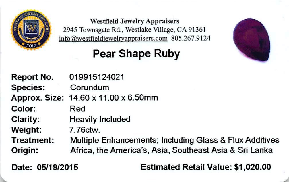 One pear mixed cut natural ruby, measuring 14.60 x 11.00 x 6.50mm, exact weight 7.76ct., clarity is heavily included, type II, dark, very slightly brownish, red color, (GIA R 7/3), cut is good. Transmitting light somewhat diffusely, transparent to translucent. Naturally occurring internal & external characteristics are present. Indications of laboratory high temperature heat treatment, with glass & flux additives. Westfield Appraised at $1,020.00.