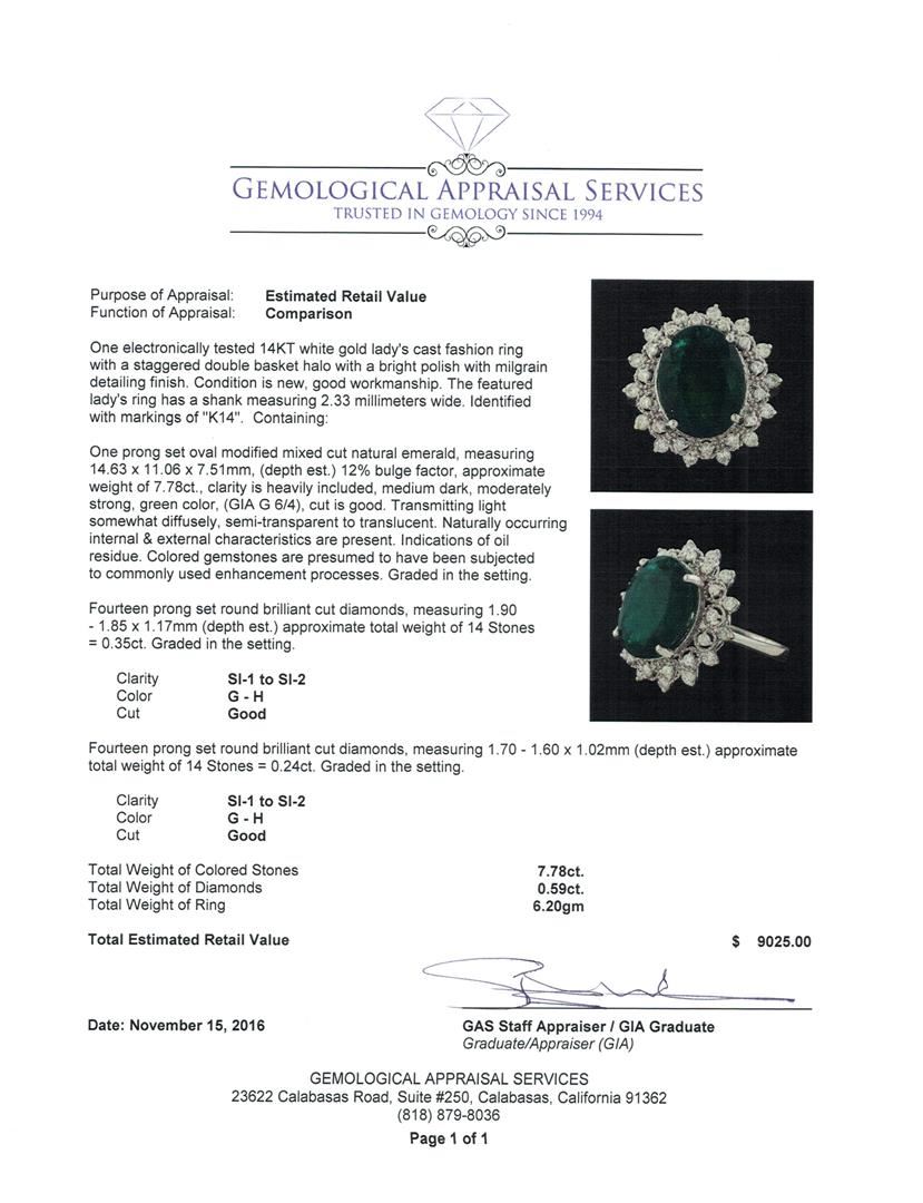 One electronically tested 14KT white gold lady's cast fashion ring with a staggered double basket halo with a bright polish with milgrain detailing finish. The featured lady's ring has a shank measuring 2.33 millimeters wide. Identified with markings of 'K14'. Condition is new, good workmanship. Containing: One prong set oval modified mixed cut natural emerald, measuring 14.63 x 11.06 x 7.51mm, (depth est.) 12%. bulge factor, approximate weight of 7.78ct., clarity is heavily included, medium dark, moderately strong, green color, (GIA G 6/4), cut is good. Transmitting light somewhat diffusely, semi-transparent to translucent. Naturally occurring internal & external characteristics are present. Indications of oil residue. Colored gemstones are presumed to have been subjected to commonly used enhancement processes. Graded in the setting. Fourteen prong set round brilliant cut diamonds, measuring 1.90 - 1.85 x 1.17mm (depth est.) approximate total weight of 14 Stones = 0.35ct. Graded in the setting. Clarity SI-1 to SI-2. Color: G - H Cut Good Fourteen prong set round brilliant cut diamonds, measuring 1.70 - 1.60 x 1.02mm (depth est.) approximate total weight of 14 Stones = 0.24ct. Graded in the setting. Clarity SI-1 to SI-2. Color: G - H Cut Good. Total Weight of Colored Stones 7.78ct.. Total Weight of Diamonds 0.59ct.. Total Weight of Ring 6.20gm. GAS Appraised at $9,025.00.