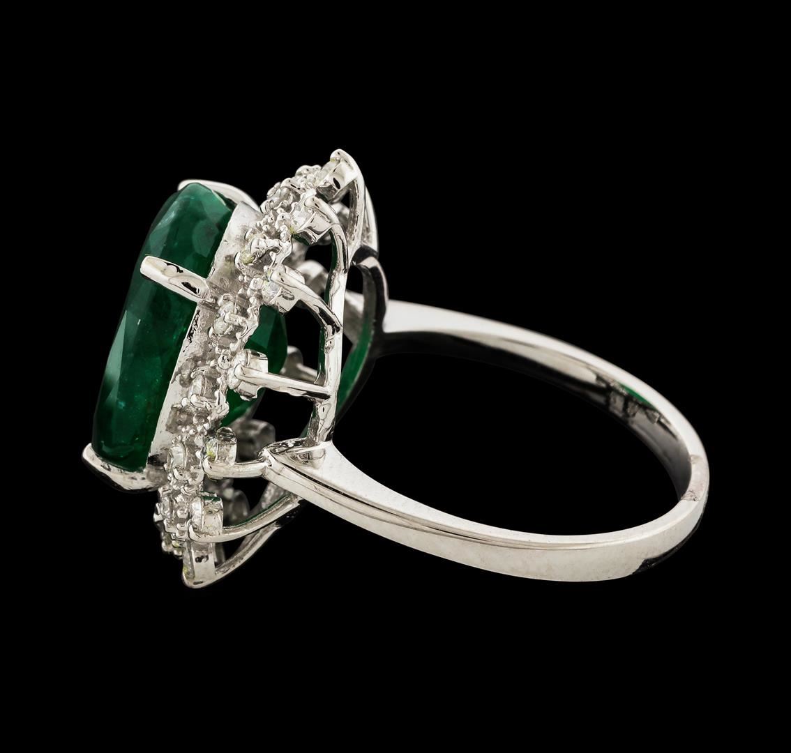One electronically tested 14KT white gold lady's cast fashion ring with a staggered double basket halo with a bright polish with milgrain detailing finish. The featured lady's ring has a shank measuring 2.33 millimeters wide. Identified with markings of 'K14'. Condition is new, good workmanship. Containing: One prong set oval modified mixed cut natural emerald, measuring 14.63 x 11.06 x 7.51mm, (depth est.) 12%. bulge factor, approximate weight of 7.78ct., clarity is heavily included, medium dark, moderately strong, green color, (GIA G 6/4), cut is good. Transmitting light somewhat diffusely, semi-transparent to translucent. Naturally occurring internal & external characteristics are present. Indications of oil residue. Colored gemstones are presumed to have been subjected to commonly used enhancement processes. Graded in the setting. Fourteen prong set round brilliant cut diamonds, measuring 1.90 - 1.85 x 1.17mm (depth est.) approximate total weight of 14 Stones = 0.35ct. Graded in the setting. Clarity SI-1 to SI-2. Color: G - H Cut Good Fourteen prong set round brilliant cut diamonds, measuring 1.70 - 1.60 x 1.02mm (depth est.) approximate total weight of 14 Stones = 0.24ct. Graded in the setting. Clarity SI-1 to SI-2. Color: G - H Cut Good. Total Weight of Colored Stones 7.78ct.. Total Weight of Diamonds 0.59ct.. Total Weight of Ring 6.20gm. GAS Appraised at $9,025.00.