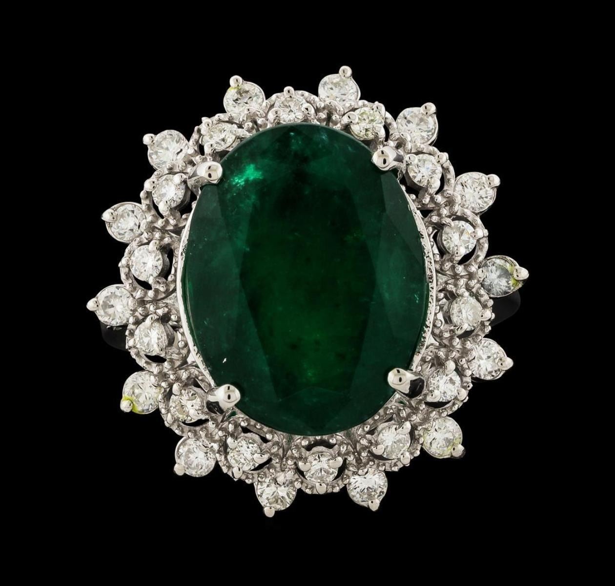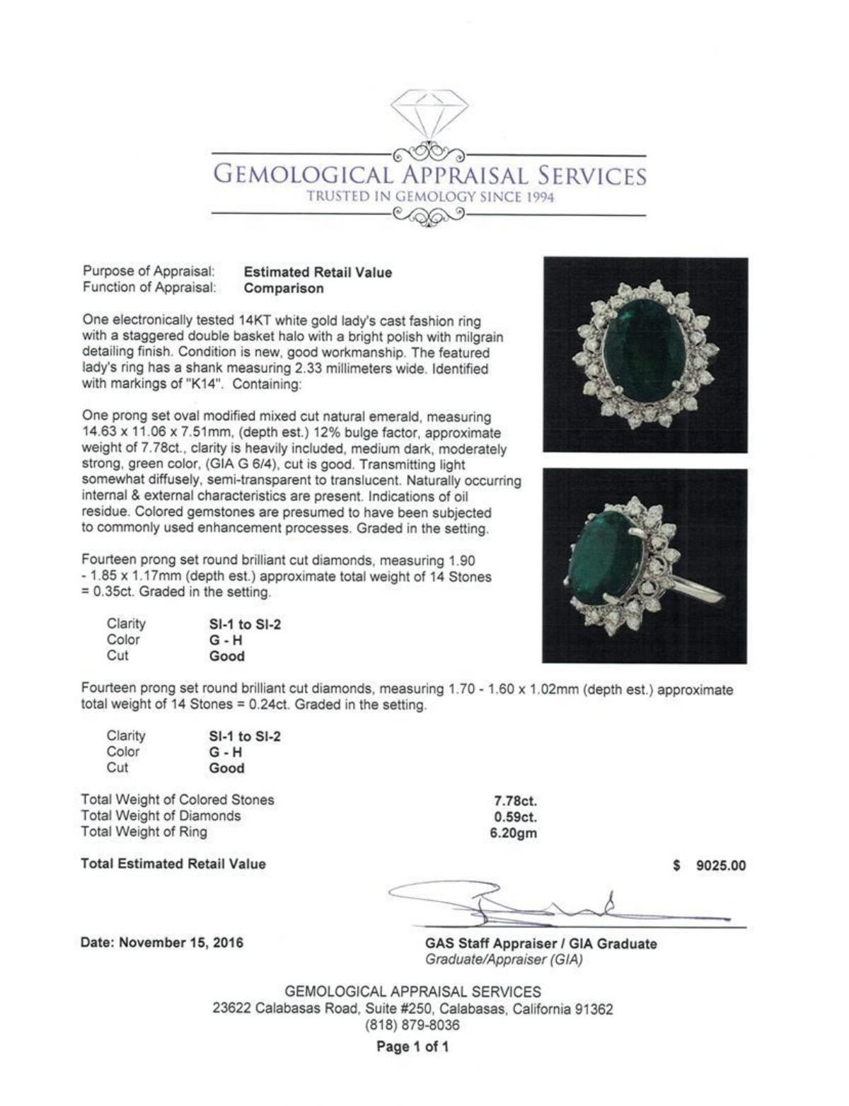 One electronically tested 14KT white gold lady's cast fashion ring with a staggered double basket halo with a bright polish with milgrain detailing finish. The featured lady's ring has a shank measuring 2.33 millimeters wide. Identified with markings of 'K14'. Condition is new, good workmanship. Containing: One prong set oval modified mixed cut natural emerald, measuring 14.63 x 11.06 x 7.51mm, (depth est.) 12%. bulge factor, approximate weight of 7.78ct., clarity is heavily included, medium dark, moderately strong, green color, (GIA G 6/4), cut is good. Transmitting light somewhat diffusely, semi-transparent to translucent. Naturally occurring internal & external characteristics are present. Indications of oil residue. Colored gemstones are presumed to have been subjected to commonly used enhancement processes. Graded in the setting. Fourteen prong set round brilliant cut diamonds, measuring 1.90 - 1.85 x 1.17mm (depth est.) approximate total weight of 14 Stones = 0.35ct. Graded in the setting. Clarity SI-1 to SI-2. Color: G - H Cut Good Fourteen prong set round brilliant cut diamonds, measuring 1.70 - 1.60 x 1.02mm (depth est.) approximate total weight of 14 Stones = 0.24ct. Graded in the setting. Clarity SI-1 to SI-2. Color: G - H Cut Good. Total Weight of Colored Stones 7.78ct.. Total Weight of Diamonds 0.59ct.. Total Weight of Ring 6.20gm. GAS Appraised.