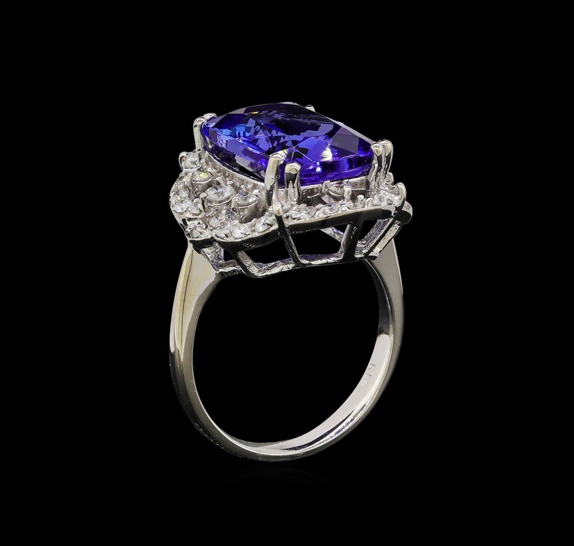 One electronically tested 14KT white gold lady's cast fashion ring with a scalloped basket halo with a bright polish finish. The featured lady's ring has a shank measuring 2.89 millimeters wide. Identified with markings of 'K14'. Condition is new, good workmanship. Containing: One prong set oval modified brilliant cut natural tanzanite, measuring 14.55 x 10.05 x 5.95mm, (depth est.) 25%. bulge factor, approximate weight of 7.78ct., clarity is eye clean, medium, moderately strong, violetish blue color, (GIA vB 5/4), cut is very good. Transmitting light with no distortion, transparent. Colored gemstones are presumed to have been subjected to commonly used enhancement processes. Graded in the setting. Two prong set round brilliant cut diamonds, measuring 2.40 - 2.35 x 1.45mm (depth est.) approximate total weight of 2 Stones = 0.10ct. Graded in the setting. Clarity SI-1 to SI-2. Color: H - I Cut Good Ten prong set round brilliant cut diamonds, measuring 2.00 - 1.95 x 1.23mm (depth est.) approximate total weight of 10 Stones = 0.29ct. Graded in the setting. Clarity SI-1 to I-1. Color: H - I Cut Good Twenty-Six prong set round brilliant cut diamonds, measuring 1.60 - 1.50 x 0.96mm (depth est.) approximate total weight of 26 Stones = 0.37ct. Graded in the setting. Clarity SI-1 to I-1. Color: H - I Cut Good Two prong set round brilliant cut diamonds, measuring 1.30 - 1.25 x 0.79mm (depth est.) approximate total weight of 2 Stones = 0.02ct. Graded in the setting. Clarity SI-1 to SI-2. Color: H - I Cut Good. Total Weight of Colored Stones 7.78ct.. Total Weight of Diamonds 0.78ct.. Total Weight of Ring 7.70gm GAS Appraised at $15,340.00.