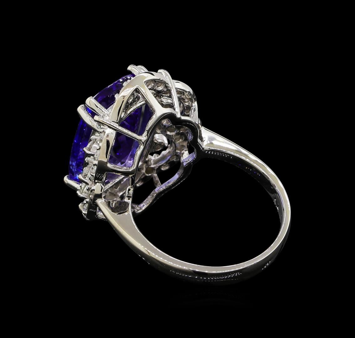 One electronically tested 14KT white gold lady's cast fashion ring with a scalloped basket halo with a bright polish finish. The featured lady's ring has a shank measuring 2.89 millimeters wide. Identified with markings of 'K14'. Condition is new, good workmanship. Containing: One prong set oval modified brilliant cut natural tanzanite, measuring 14.55 x 10.05 x 5.95mm, (depth est.) 25%. bulge factor, approximate weight of 7.78ct., clarity is eye clean, medium, moderately strong, violetish blue color, (GIA vB 5/4), cut is very good. Transmitting light with no distortion, transparent. Colored gemstones are presumed to have been subjected to commonly used enhancement processes. Graded in the setting. Two prong set round brilliant cut diamonds, measuring 2.40 - 2.35 x 1.45mm (depth est.) approximate total weight of 2 Stones = 0.10ct. Graded in the setting. Clarity SI-1 to SI-2. Color: H - I Cut Good Ten prong set round brilliant cut diamonds, measuring 2.00 - 1.95 x 1.23mm (depth est.) approximate total weight of 10 Stones = 0.29ct. Graded in the setting. Clarity SI-1 to I-1. Color: H - I Cut Good Twenty-Six prong set round brilliant cut diamonds, measuring 1.60 - 1.50 x 0.96mm (depth est.) approximate total weight of 26 Stones = 0.37ct. Graded in the setting. Clarity SI-1 to I-1. Color: H - I Cut Good Two prong set round brilliant cut diamonds, measuring 1.30 - 1.25 x 0.79mm (depth est.) approximate total weight of 2 Stones = 0.02ct. Graded in the setting. Clarity SI-1 to SI-2. Color: H - I Cut Good. Total Weight of Colored Stones 7.78ct.. Total Weight of Diamonds 0.78ct.. Total Weight of Ring 7.70gm GAS Appraised at $15,340.00.