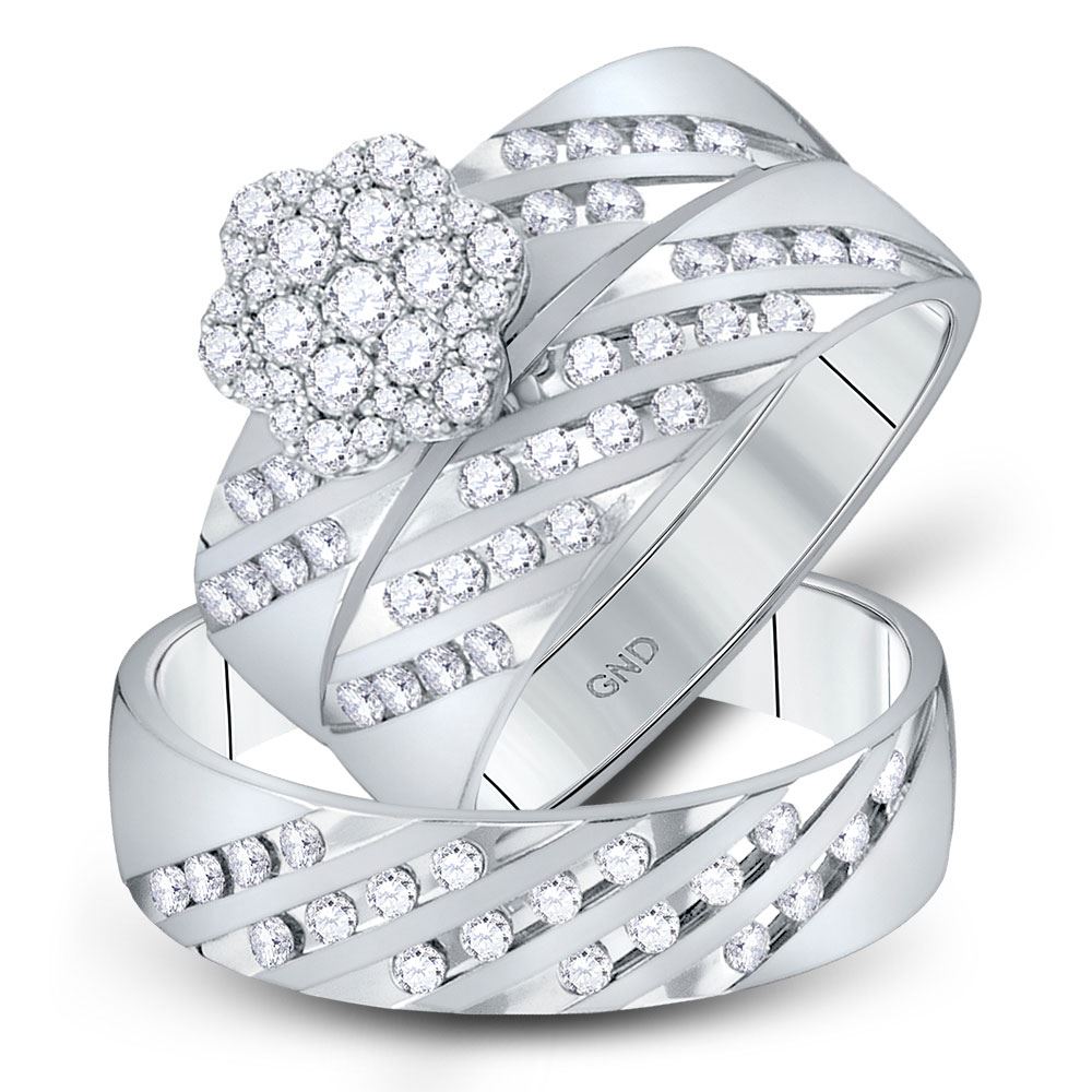 REF-122M6F - 7/8 CTW His Hers Round Diamond Cluster Matching Wedding Set 14kt White Gold - REF-122M6F