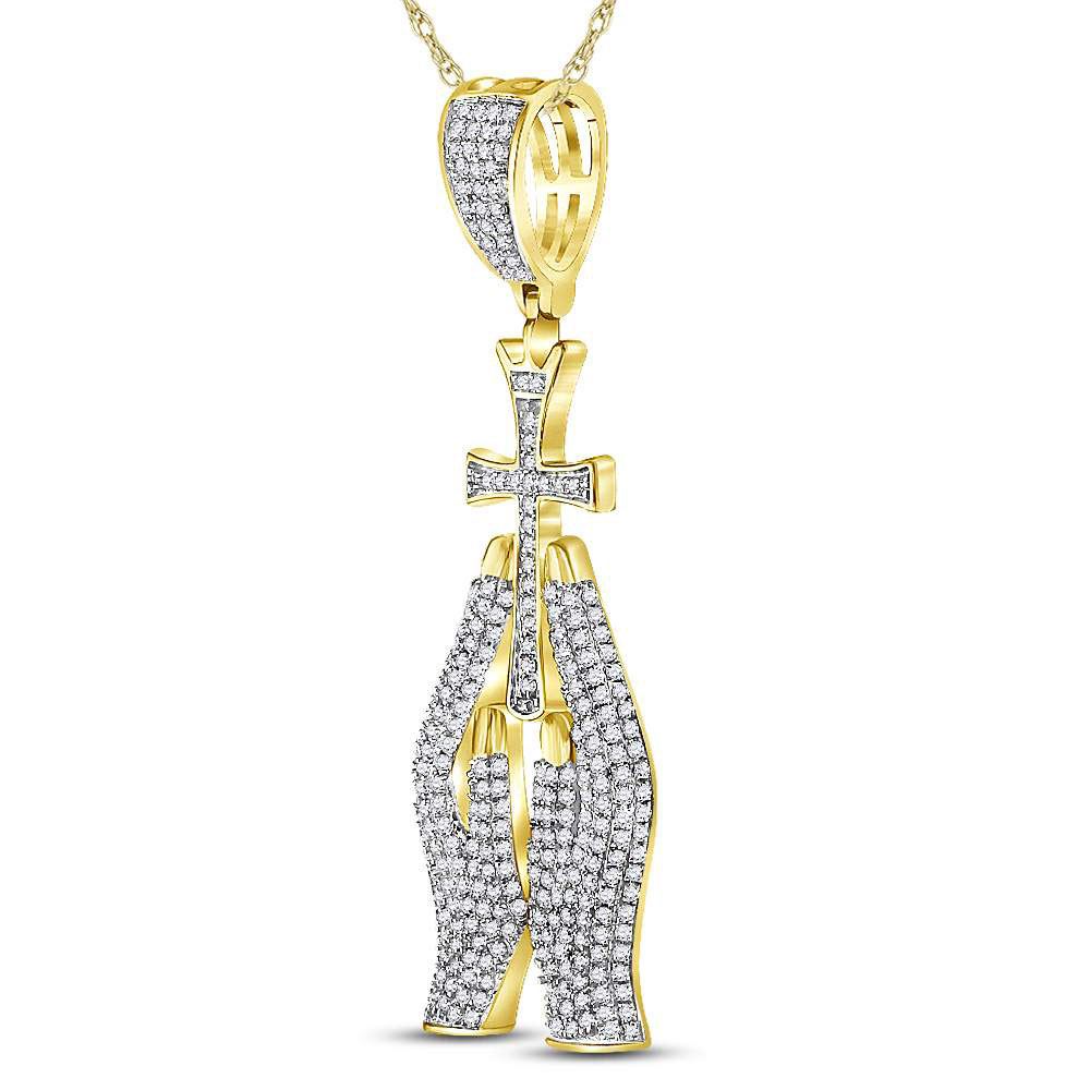 REF-57X5T ---- 7/8 CTW Mens Round Diamond Praying Hands Cross Charm Pendant 10kt Yellow Gold