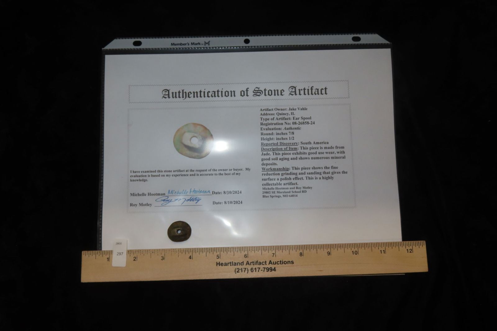 b) At the time of payment the buyer must notify Heartland Artifact Auctions INC of their intent to send the item or items to one of the following authenticators; Jerry Dickey, Maury Meadows, Sam Johnson, Roy Motley and Ken Partain. This notification must come via email to info@heartlandartifacts.com.