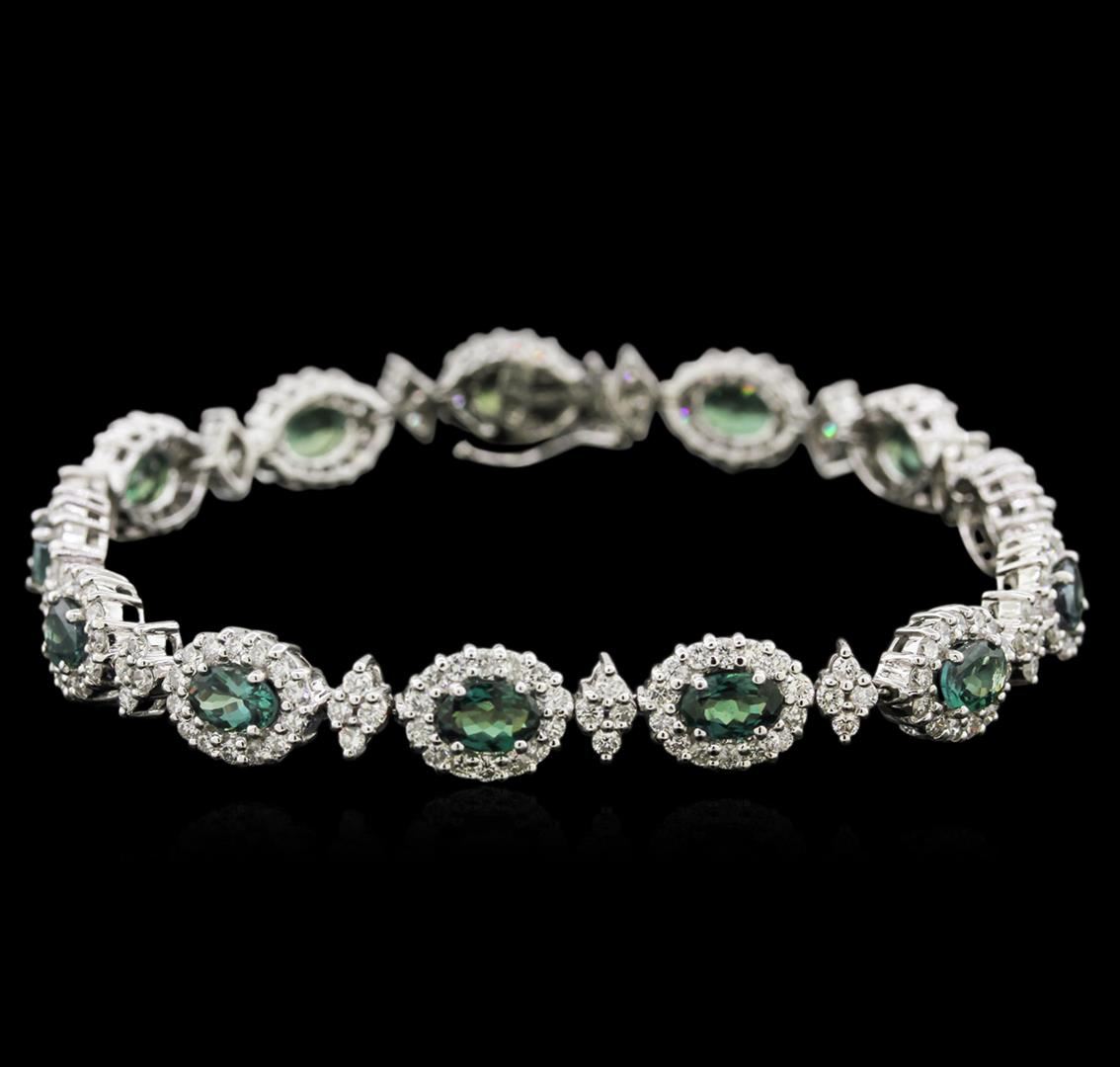 One electronically tested 14KT white gold lady's combination cast & assembled fashion bracelet with a tongue clasp with foldover safety with a bright polish finish. The featured lady's bracelet contains 13 oval halo settings and measures 7.5 inches in length. Identified with markings of "14K". Condition is new, good workmanship. Containing: Thirteen prong set oval modified brilliant cut natural alexandrites, measuring 6.50 x 4.30 x 2.48mm, 10% bulge factor, approximate total weight of 7.80ct., clarity is slightly included, type II, medium dark, slightly grayish, bluish green color, (GIA bG 6/2) to medium dark, very slightly grayish, slightly purplish red, (GIA slpR 6/3), cut is good. and 20%. change of color. Transmitting light with a minimum of distortion, transparent. Colored gemstones are presumed to have been subjected to commonly used enhancement processes. Graded in the setting. Two Hundred Thirty-Four prong set round brilliant cut diamonds, measuring 1.50 - 1.40 x 0.94mm (depth est.) approximate total weight of 234 Stones = 2.80ct. Graded in the setting. Clarity: SI-1 to I-1. Color: H - I. Cut Good. Total Weight of Colored Stones 7.80ct. Total Weight of Diamonds 2.80ct. Total Weight of Bracelet 19.50gm. GAS Appraised at $49,305.00.