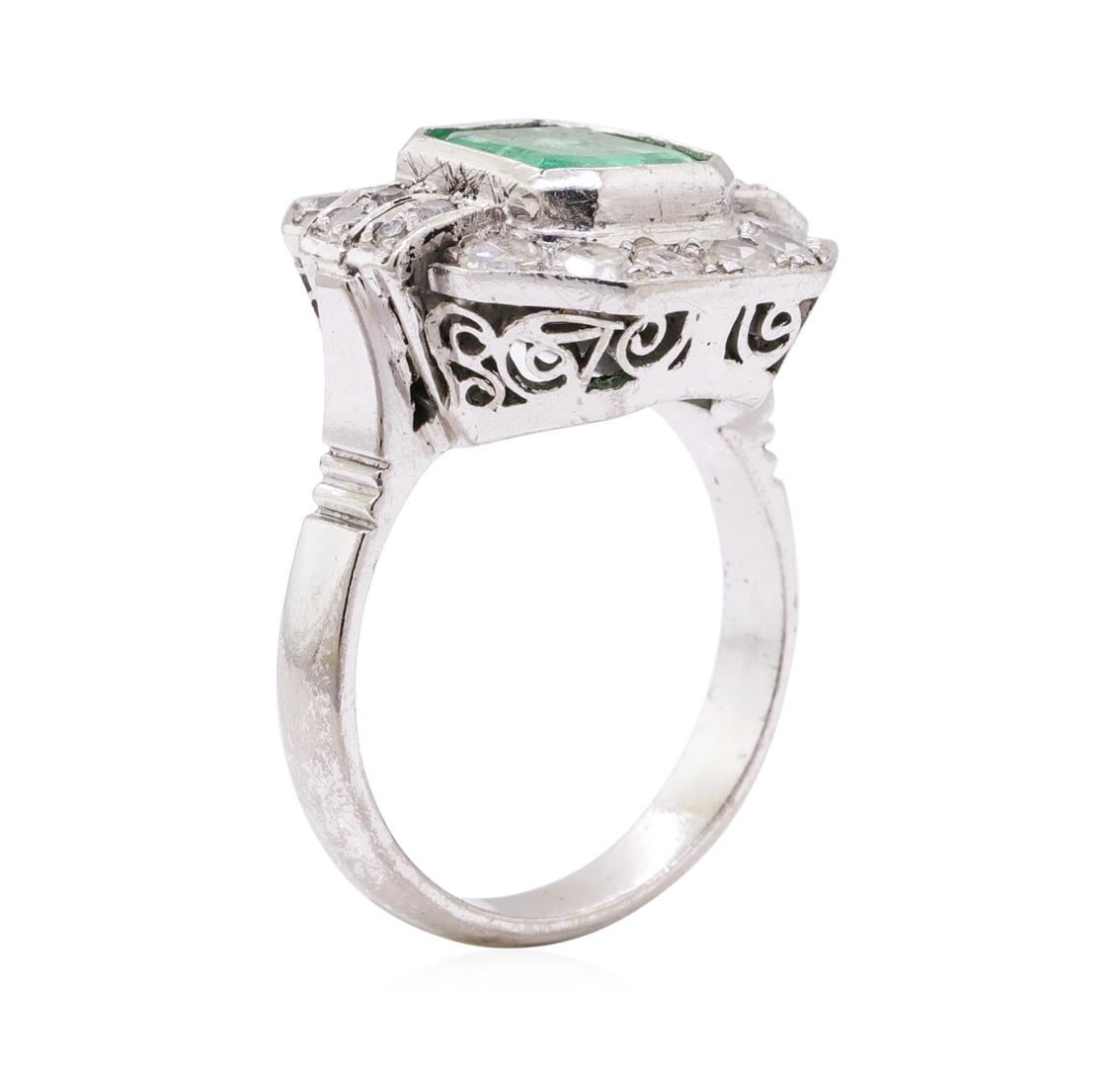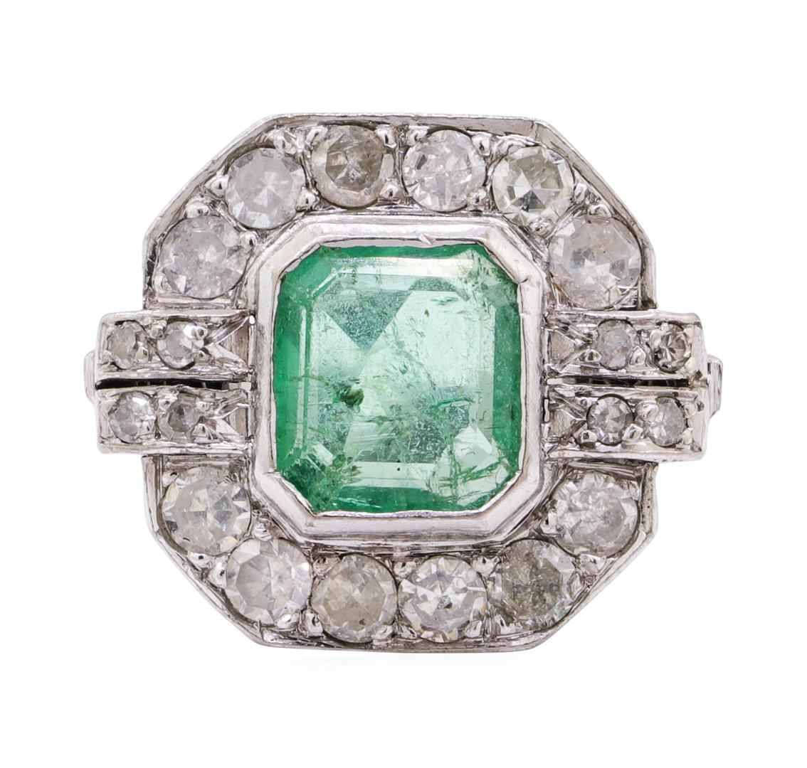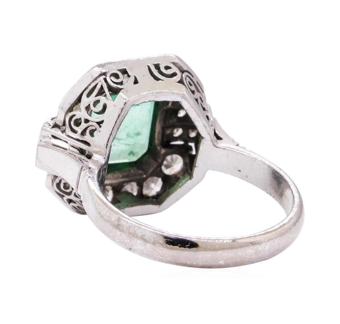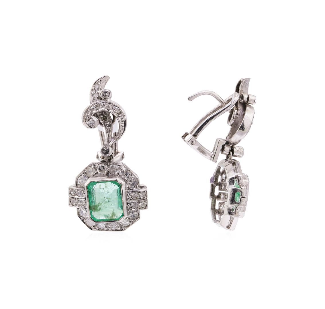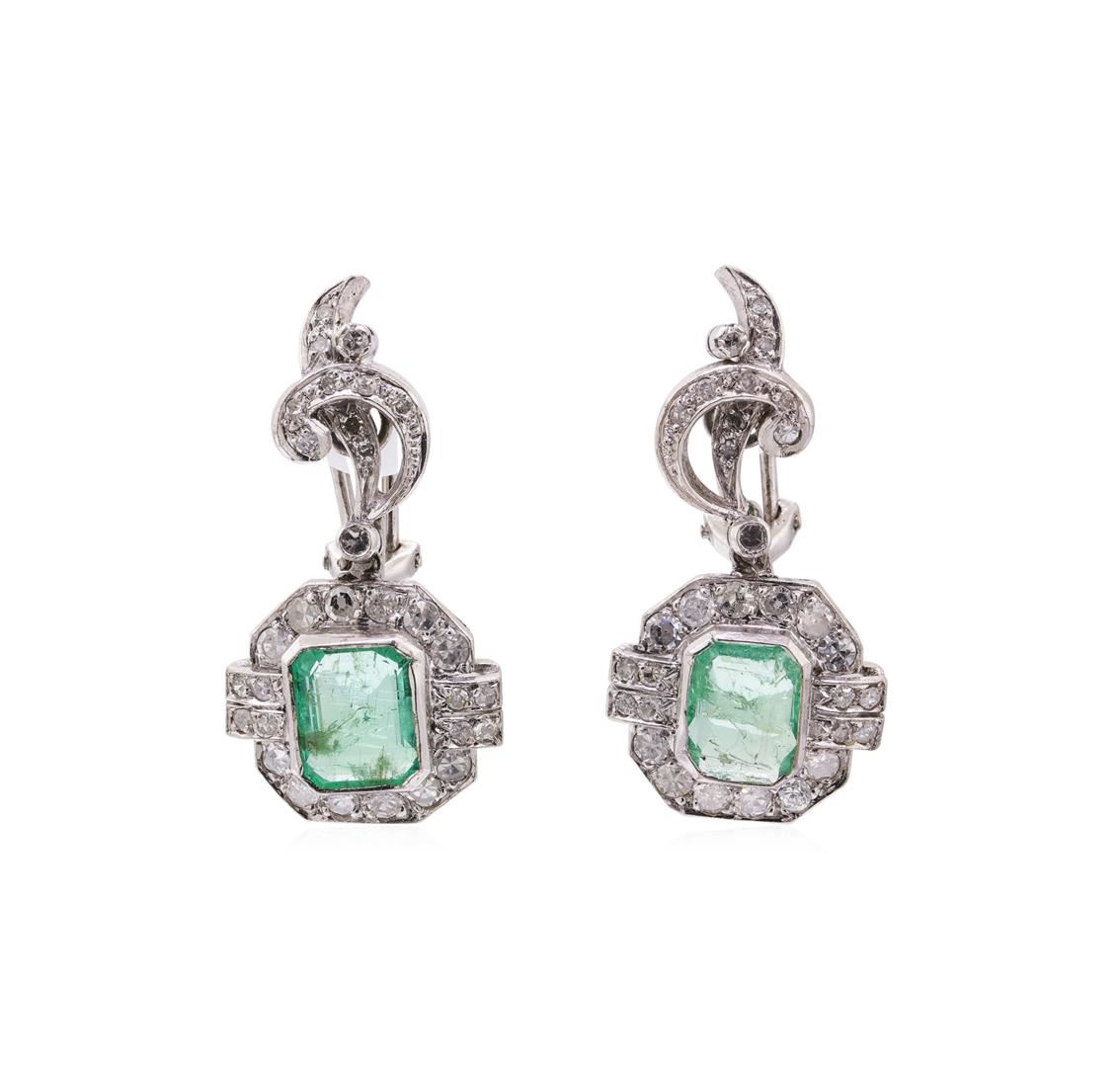 One set electronically tested 14KT white gold lady's combination cast & assembled vintage fashion ring and earrings with Omega clip backs with posts with a bright polish finish. The featured lady's ring has a shank measuring 3.00 millimeters wide. The earrings have a drop of approximately 33 millimeters. Condition is used, good workmanship. Containing: Three bezel set emerald standard step cut natural emeralds, measuring 8.70 x 7.24 x 3.67mm, (depth est.) approximate total weight of 5.10ct., clarity is heavily included, medium light, moderately strong, green color, (GIA G 4/4), cut is good. Transmitting light somewhat diffusely, semi-transparent to translucent. Colored gemstones are presumed to have been subjected to commonly used enhancement processes. Graded in the setting. Thirty-Six prong set single cut diamonds, measuring 2.90 - 2.40 x 1.50mm (depth est.) approximate total weight of 36 Stones = 2.30ct. Graded in the setting. Color I Clarity I-1 to I-2 Cut Good Forty-Six prong set single cut diamonds, measuring 1.40 - 1.25 x 0.82mm (depth est.) approximate total weight of 46 Stones = 0.40ct. Graded in the setting. Color H - J Clarity SI-2 to I-2 Cut Good. Total Weight of Colored Stones 5.10ct.. Total Weight of Diamonds 2.70ct.. Total Weight of Ring And Earrings 16.60gm GAS Appraised at $8000.00. GAS Appraised at $8,000.00.