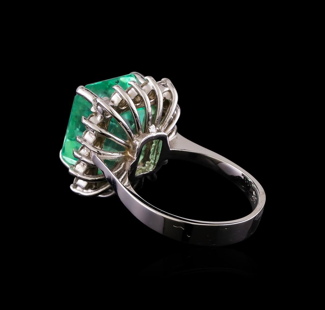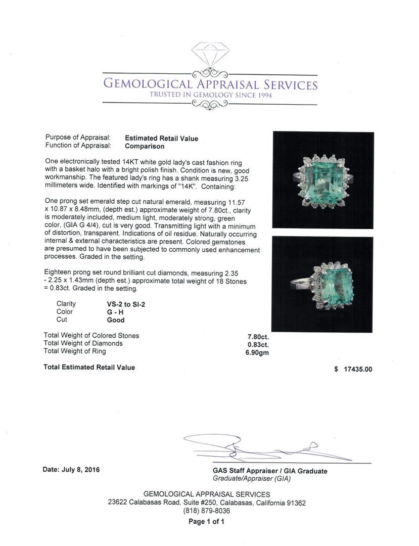 One electronically tested 14KT white gold lady's cast fashion ring with a basket halo with a bright polish finish. The featured lady's ring has a shank measuring 3.25 millimeters wide. Identified with markings of "14K". Condition is new, good workmanship. Containing: One prong set emerald step cut natural emerald, measuring 11.57 x 10.87 x 8.48mm, (depth est.) approximate weight of 7.80ct., clarity is moderately included, medium light, moderately strong, green color, (GIA G 4/4), cut is very good. Transmitting light with a minimum of distortion, transparent. Indications of oil residue. Naturally occurring internal & external characteristics are present. Colored gemstones are presumed to have been subjected to commonly used enhancement processes. Graded in the setting. Eighteen prong set round brilliant cut diamonds, measuring 2.35 - 2.25 x 1.43mm (depth est.) approximate total weight of 18 Stones = 0.83ct. Graded in the setting. Clarity: VS-2 to SI-2. Color: G - Good. Total Weight of Colored Stones 7.80ct. Total Weight of Diamonds 0.83ct. Total Weight of Ring 6.90gm. GAS Appraised at $17,435.00.