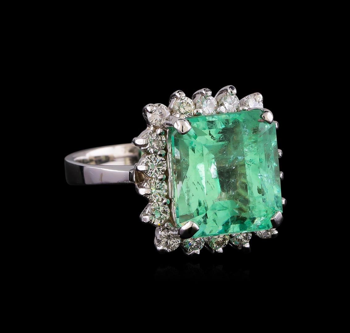 One electronically tested 14KT white gold lady's cast fashion ring with a basket halo with a bright polish finish. The featured lady's ring has a shank measuring 3.25 millimeters wide. Identified with markings of "14K". Condition is new, good workmanship. Containing: One prong set emerald step cut natural emerald, measuring 11.57 x 10.87 x 8.48mm, (depth est.) approximate weight of 7.80ct., clarity is moderately included, medium light, moderately strong, green color, (GIA G 4/4), cut is very good. Transmitting light with a minimum of distortion, transparent. Indications of oil residue. Naturally occurring internal & external characteristics are present. Colored gemstones are presumed to have been subjected to commonly used enhancement processes. Graded in the setting. Eighteen prong set round brilliant cut diamonds, measuring 2.35 - 2.25 x 1.43mm (depth est.) approximate total weight of 18 Stones = 0.83ct. Graded in the setting. Clarity: VS-2 to SI-2. Color: G - Good. Total Weight of Colored Stones 7.80ct. Total Weight of Diamonds 0.83ct. Total Weight of Ring 6.90gm. GAS Appraised at $17,435.00.