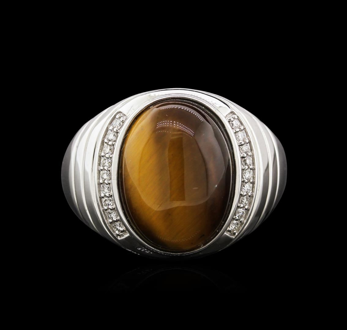 One ring featuring: 14KT white gold weighing 8.60 grams containing one tiger eye center stone with a total weight of 7.80ct and diamonds with a total weight of 0.20ct.