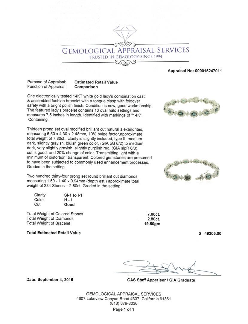One electronically tested 14KT white gold lady's combination cast & assembled fashion bracelet with a tongue clasp with foldover safety with a bright polish finish. The featured lady's bracelet contains 13 oval halo settings and measures 7.5 inches in length. Identified with markings of "14K". Condition is new, good workmanship. Containing: Thirteen prong set oval modified brilliant cut natural alexandrites, measuring 6.50 x 4.30 x 2.48mm, 10% bulge factor, approximate total weight of 7.80ct., clarity is slightly included, type II, medium dark, slightly grayish, bluish green color, (GIA bG 6/2) to medium dark, very slightly grayish, slightly purplish red, (GIA slpR 6/3), cut is good. and 20%. change of color. Transmitting light with a minimum of distortion, transparent. Colored gemstones are presumed to have been subjected to commonly used enhancement processes. Graded in the setting. Two Hundred Thirty-Four prong set round brilliant cut diamonds, measuring 1.50 - 1.40 x 0.94mm (depth est.) approximate total weight of 234 Stones = 2.80ct. Graded in the setting. Clarity: SI-1 to I-1. Color: H - I. Cut Good. Total Weight of Colored Stones 7.80ct. Total Weight of Diamonds 2.80ct. Total Weight of Bracelet 19.50gm. GAS Appraised at $49,305.00.