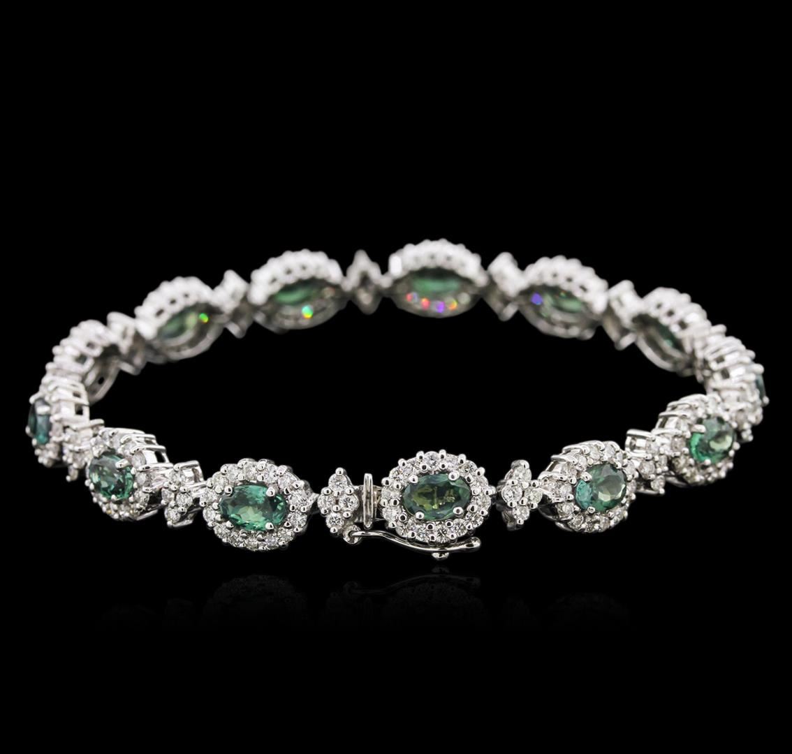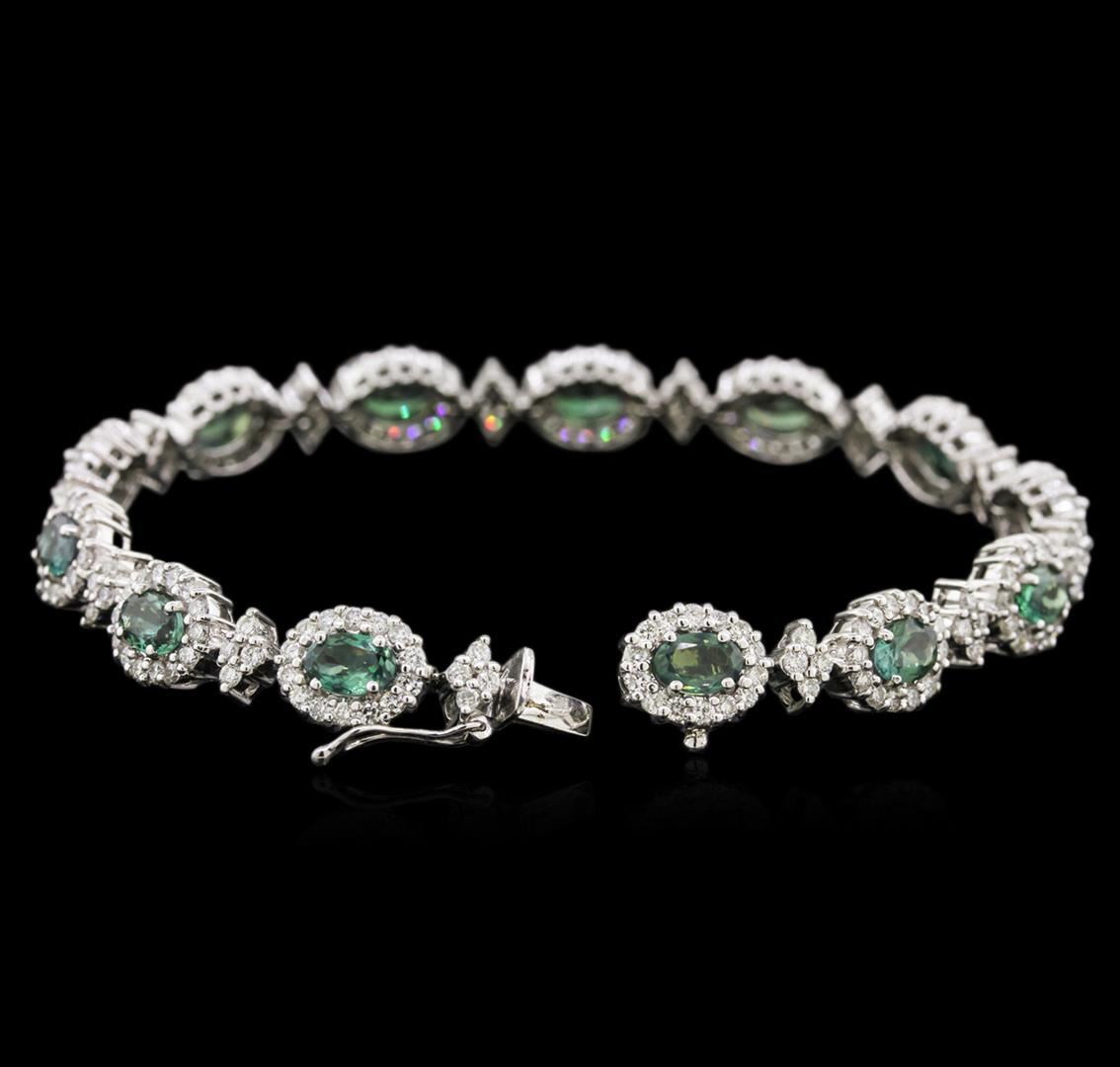 One electronically tested 14KT white gold lady's combination cast & assembled fashion bracelet with a tongue clasp with foldover safety with a bright polish finish. The featured lady's bracelet contains 13 oval halo settings and measures 7.5 inches in length. Identified with markings of "14K". Condition is new, good workmanship. Containing: Thirteen prong set oval modified brilliant cut natural alexandrites, measuring 6.50 x 4.30 x 2.48mm, 10% bulge factor, approximate total weight of 7.80ct., clarity is slightly included, type II, medium dark, slightly grayish, bluish green color, (GIA bG 6/2) to medium dark, very slightly grayish, slightly purplish red, (GIA slpR 6/3), cut is good. and 20%. change of color. Transmitting light with a minimum of distortion, transparent. Colored gemstones are presumed to have been subjected to commonly used enhancement processes. Graded in the setting. Two Hundred Thirty-Four prong set round brilliant cut diamonds, measuring 1.50 - 1.40 x 0.94mm (depth est.) approximate total weight of 234 Stones = 2.80ct. Graded in the setting. Clarity: SI-1 to I-1. Color: H - I. Cut Good. Total Weight of Colored Stones 7.80ct. Total Weight of Diamonds 2.80ct. Total Weight of Bracelet 19.50gm. GAS Appraised at $49,305.00.