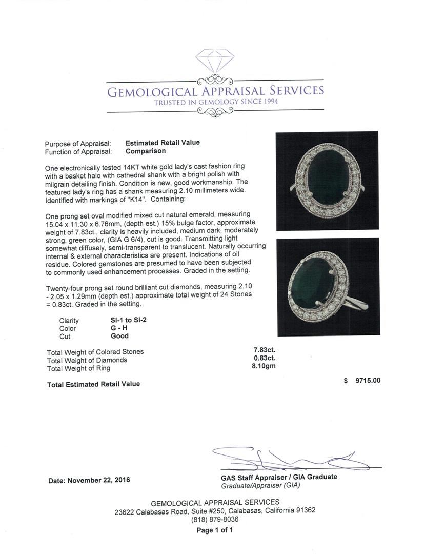 One electronically tested 14KT white gold lady's cast fashion ring with a basket halo with cathedral shank with a bright polish with milgrain detailing finish. The featured lady's ring has a shank measuring 2.10 millimeters wide. Identified with markings of 'K14'. Condition is new, good workmanship. Containing: One prong set oval modified mixed cut natural emerald, measuring 15.04 x 11.30 x 6.76mm, (depth est.) 15%. bulge factor, approximate weight of 7.83ct., clarity is heavily included, medium dark, moderately strong, green color, (GIA G 6/4), cut is good. Transmitting light somewhat diffusely, semi-transparent to translucent. Naturally occurring internal & external characteristics are present. Indications of oil residue. Colored gemstones are presumed to have been subjected to commonly used enhancement processes. Graded in the setting. Twenty-Four prong set round brilliant cut diamonds, measuring 2.10 - 2.05 x 1.29mm (depth est.) approximate total weight of 24 Stones = 0.83ct. Graded in the setting. Clarity SI-1 to SI-2. Color: G - H Cut Good. Total Weight of Colored Stones 7.83ct.. Total Weight of Diamonds 0.83ct.. Total Weight of Ring 8.10gm. GAS Appraised at $9,715.00.