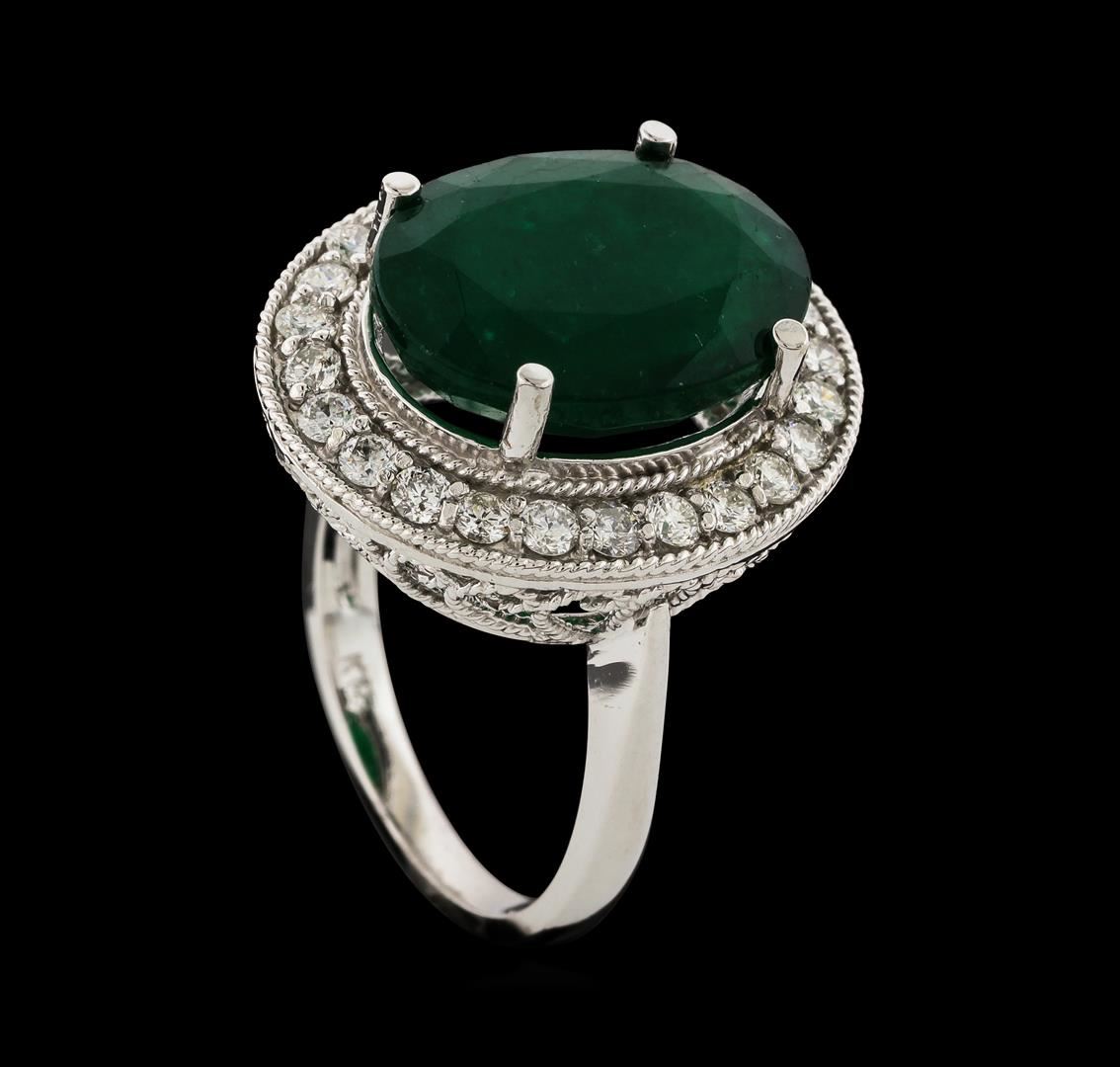 One electronically tested 14KT white gold lady's cast fashion ring with a basket halo with cathedral shank with a bright polish with milgrain detailing finish. The featured lady's ring has a shank measuring 2.10 millimeters wide. Identified with markings of 'K14'. Condition is new, good workmanship. Containing: One prong set oval modified mixed cut natural emerald, measuring 15.04 x 11.30 x 6.76mm, (depth est.) 15%. bulge factor, approximate weight of 7.83ct., clarity is heavily included, medium dark, moderately strong, green color, (GIA G 6/4), cut is good. Transmitting light somewhat diffusely, semi-transparent to translucent. Naturally occurring internal & external characteristics are present. Indications of oil residue. Colored gemstones are presumed to have been subjected to commonly used enhancement processes. Graded in the setting. Twenty-Four prong set round brilliant cut diamonds, measuring 2.10 - 2.05 x 1.29mm (depth est.) approximate total weight of 24 Stones = 0.83ct. Graded in the setting. Clarity SI-1 to SI-2. Color: G - H Cut Good. Total Weight of Colored Stones 7.83ct.. Total Weight of Diamonds 0.83ct.. Total Weight of Ring 8.10gm. GAS Appraised at $9,715.00.