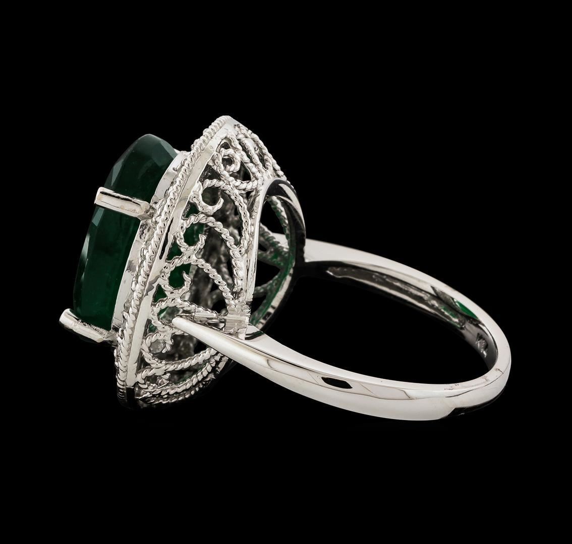 One electronically tested 14KT white gold lady's cast fashion ring with a basket halo with cathedral shank with a bright polish with milgrain detailing finish. The featured lady's ring has a shank measuring 2.10 millimeters wide. Identified with markings of 'K14'. Condition is new, good workmanship. Containing: One prong set oval modified mixed cut natural emerald, measuring 15.04 x 11.30 x 6.76mm, (depth est.) 15%. bulge factor, approximate weight of 7.83ct., clarity is heavily included, medium dark, moderately strong, green color, (GIA G 6/4), cut is good. Transmitting light somewhat diffusely, semi-transparent to translucent. Naturally occurring internal & external characteristics are present. Indications of oil residue. Colored gemstones are presumed to have been subjected to commonly used enhancement processes. Graded in the setting. Twenty-Four prong set round brilliant cut diamonds, measuring 2.10 - 2.05 x 1.29mm (depth est.) approximate total weight of 24 Stones = 0.83ct. Graded in the setting. Clarity SI-1 to SI-2. Color: G - H Cut Good. Total Weight of Colored Stones 7.83ct.. Total Weight of Diamonds 0.83ct.. Total Weight of Ring 8.10gm. GAS Appraised.