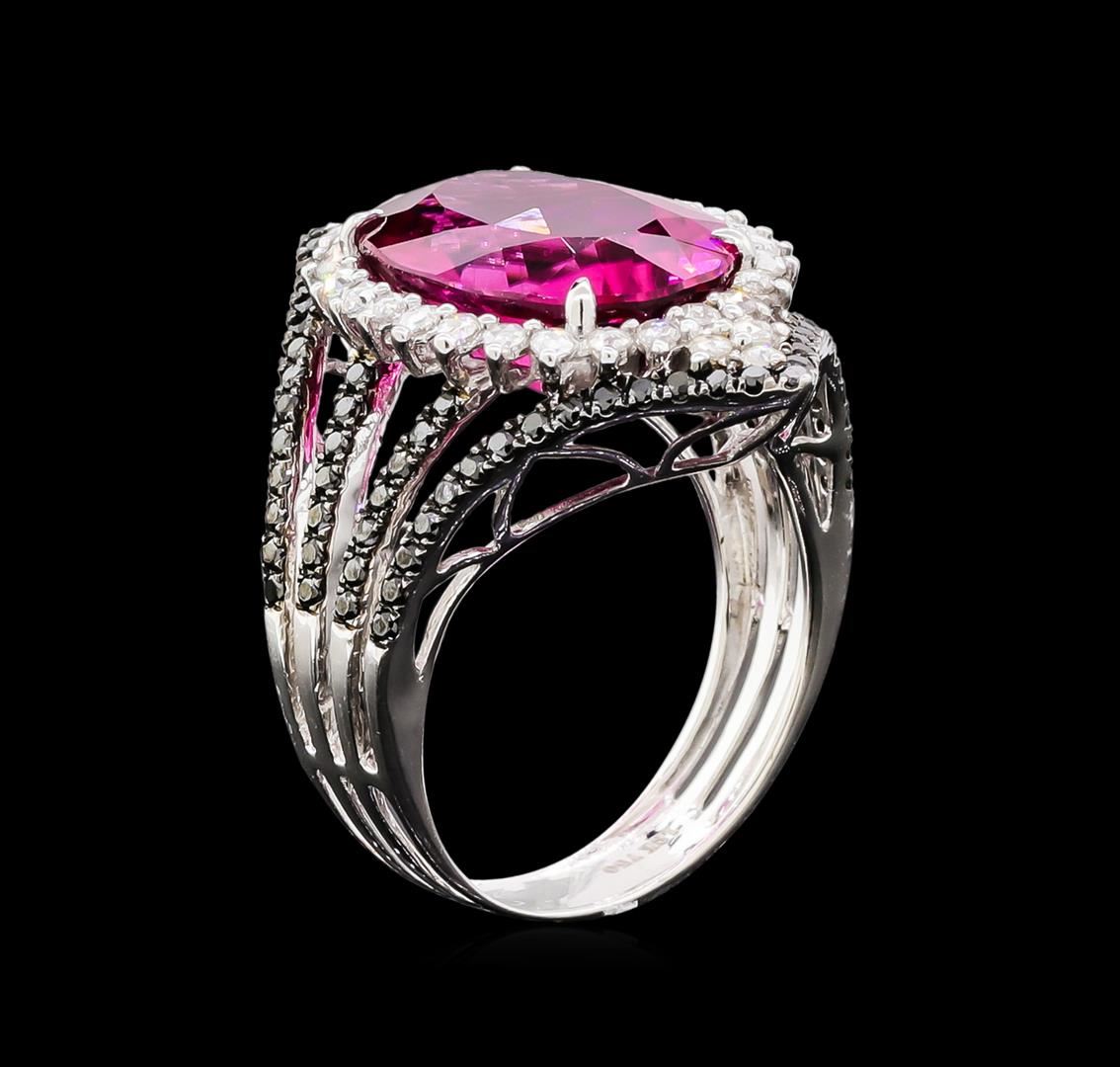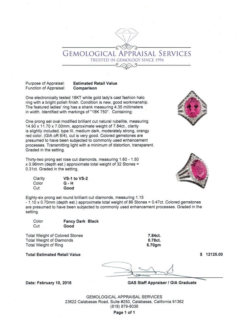 One electronically tested 18KT white gold lady's cast fashion halo ring with a bright polish finish. The featured ladies' ring has a shank measuring 4.35 millimeters in width. Identified with markings of "18K 750". Condition is new, good workmanship. Containing: One prong set oval modified brilliant cut natural rubellite, measuring 14.90 x 11.70 x 7.00mm, approximate weight of 7.84ct., clarity is slightly included, type III, medium dark, moderately strong, orangy red color, (GIA oR 6/4), cut is very good. Colored gemstones are presumed to have been subjected to commonly used enhancement processes. Transmitting light with a minimum of distortion, transparent. Graded in the setting. Thirty-Two prong set rose cut diamonds, measuring 1.60 - 1.50 x 0.96mm (depth est.) approximate total weight of 32 Stones = 0.31ct. Graded in the setting. Clarity: VS-1 to VS-2. Color: G - Good Eighty-Six prong set round brilliant cut diamonds, measuring 1.15 - 1.10 x 0.68mm (depth est.) approximate total weight of 86 Stones = 0.47ct. Colored gemstones are presumed to have been subjected to commonly used enhancement processes. Graded in the setting. Cut Good. Total Weight of Colored Stones 7.84ct. Total Weight of Diamonds 0.31ct. Total Weight of Ring 6.70gm. GAS Appraised at $12,125.00.