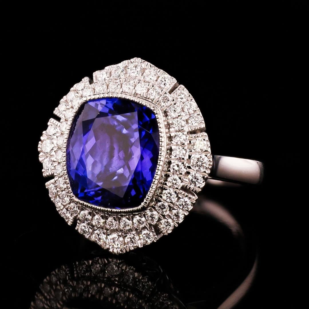 One polished, stamped, and tested platinum ring marked Oscar Friedman. The ring is mounted with: 1 genuine GIA certified tanzanite center stone weighing 7.86 carats, and 58 genuine round diamonds weighing approximately 0.69 carats. This item weighs 11.3 grams, condition is new, excellent workmanship. #MAIN GEMSTONE# GIA Report No.: 1232457468 Species: Zoisite Variety: Tanzanite Shape: Cushion Cutting Style: Brilliant Cut Crown, Modified Brilliant Cut Pavilion Measurements: 11.55 x 10.34 x 7.84mm Weight: 7.86 carats Color: Bluish Violet Transparency: Transparent Refractive Index: 1.691 - 1.700 DR Birefringence: 0.008 - 0.013 Hardness: 6.5 - 7 #ADJACENT GEMSTONES ON RING# Identity: Natural Diamond Shape: Round Cutting Style: Brilliant Cut Quantity: 58 Diamonds Measurements: 1.2 - 1.8mm Total Weight: 0.69 carats Clarity Grade: VS2-SI1 Color Grade: F-G Refractive Index: 2.417 Hardness: 10 #TANZANITE WEIGHT: 7.86 ct TOTAL DIAMOND WEIGHT: 0.69 cts WEIGHT OF ITEM: 11.3 grams METAL: Platinum Size: 7