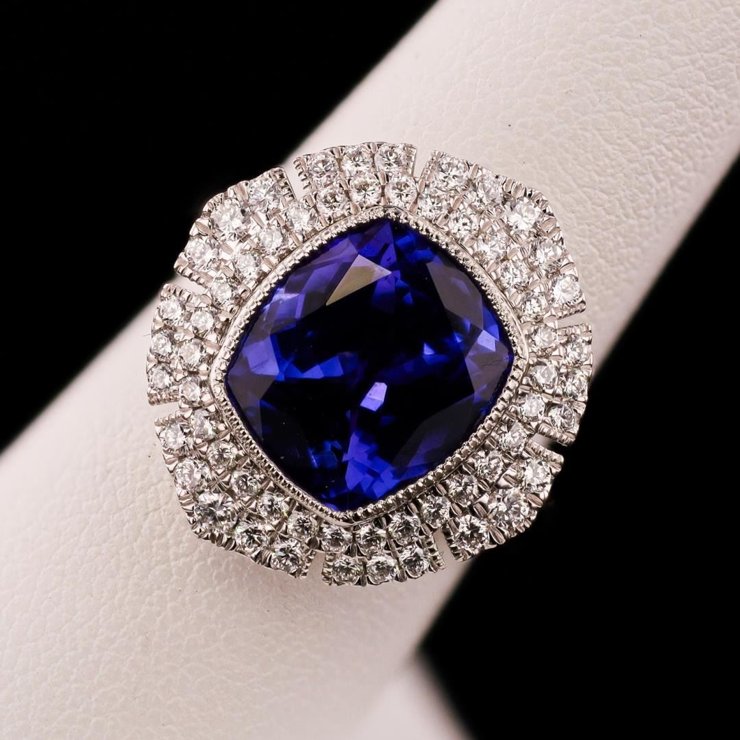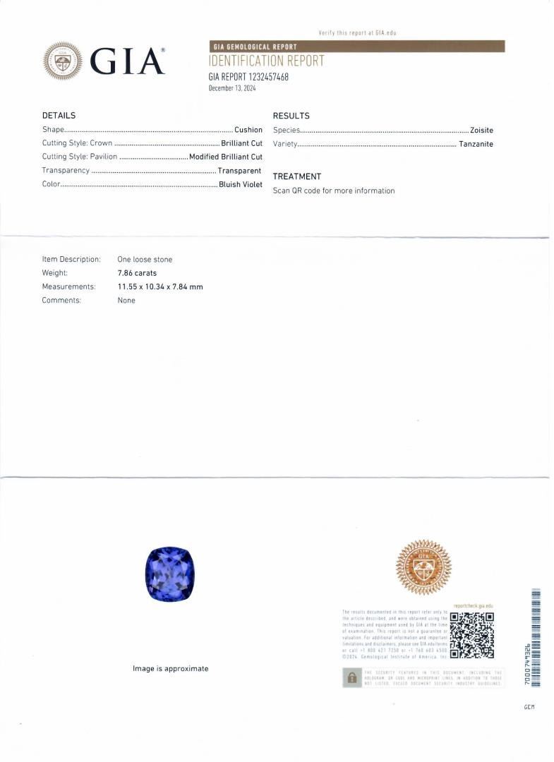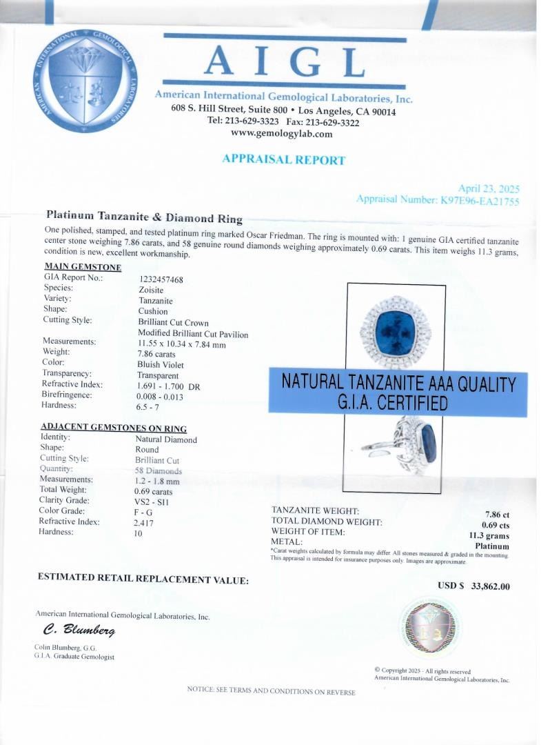 One polished, stamped, and tested platinum ring marked Oscar Friedman. The ring is mounted with: 1 genuine GIA certified tanzanite center stone weighing 7.86 carats, and 58 genuine round diamonds weighing approximately 0.69 carats. This item weighs 11.3 grams, condition is new, excellent workmanship. #MAIN GEMSTONE# GIA Report No.: 1232457468; Species: Zoisite; Variety: Tanzanite; Shape: Cushion; Cutting Style: Brilliant Cut Crown, Modified Brilliant Cut Pavilion; Measurements: 11.55 x 10.34 x 7.84mm; Weight: 7.86 carats; Color: Bluish Violet; Transparency: Transparent; Refractive Index: 1.691 - 1.700 DR; Birefringence: 0.008 - 0.013; Hardness: 6.5 - 7 #ADJACENT GEMSTONES ON RING# Identity: Natural Diamond; Shape: Round; Cutting Style: Brilliant Cut; Quantity: 58 Diamonds; Measurements: 1.2 - 1.8mm; Total Weight: 0.69 carats; Clarity Grade: VS2-SI1; Color Grade: F-G; Refractive Index: 2.417; Hardness: 10 #TANZANITE WEIGHT: 7.86 ct; TOTAL DIAMOND WEIGHT: 0.69 cts; WEIGHT OF ITEM: 11.3 grams; METAL: Platinum #Size: 7