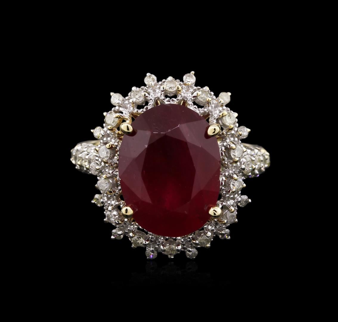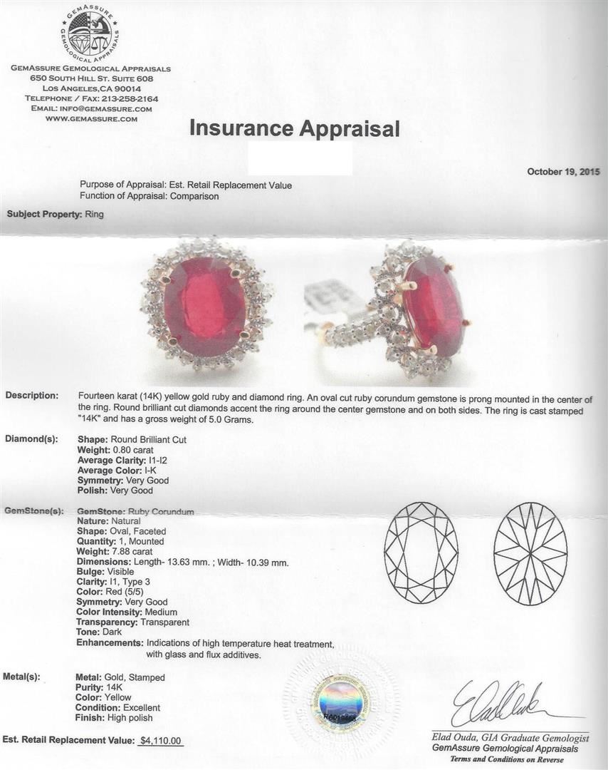 Fourteen karat (14K) yellow gold ruby and diamond ring. An oval cut ruby corundum gemstone is prong mounted in the center of the ring. Round brilliant cut diamonds accent the ring around the center gemstone and on both sides. The ring is cast stamped "14K" and has a gross weight of 5.0 Grams. Diamond(s): Shape: Round Brilliant Cut. Weight: 0.80 carat. Average Clarity: I1-I2. Average Color: I-K. Symmetry: Very Good. Polish: Very Good. Gemstone(s): GemStone: Ruby Corundum. Nature: Natural. Shape: Oval, Faceted. Quantity: 1, Mounted. Weight 7.88 carat. Dimensions: Length-13.63 mm. ; Width- 10.39 mm. Bulge: Visible. Clarity: I1, Type 3. Color: Red (5/5). Symmetry: Very Good. Color Intensity: Medium. Transparency: Transparent. Tone: Dark. Enhancements: Indications of high temperature heat treatment, with glass and flux additives. Metal(s): Metal: Gold, Stamped. Purity: 14K. Color: Yellow. Condition: Excellent. Finish: High polish. GGA Appraised.