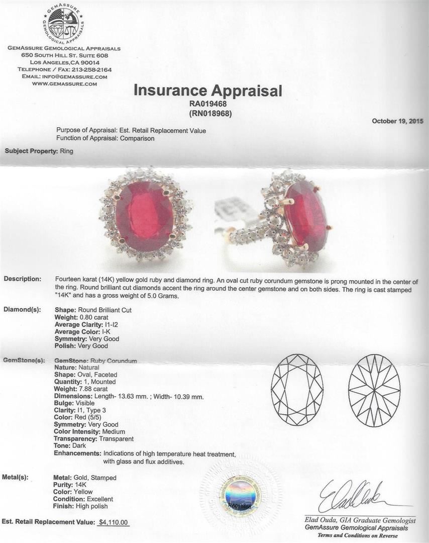 Fourteen karat (14K) yellow gold ruby and diamond ring. An oval cut ruby corundum gemstone is prong mounted in the center of the ring. Round brilliant cut diamonds accent the ring around the center gemstone and on both sides. The ring is cast stamped "14K" and has a gross weight of 5.0 Grams. Diamond(s): Shape: Round Brilliant Cut. Weight: 0.80 carat. Average Clarity: I1-I2. Average Color: I-K. Symmetry: Very Good. Polish: Very Good. Gemstone(s): GemStone: Ruby Corundum. Nature: Natural. Shape: Oval, Faceted. Quantity: 1, Mounted. Weight 7.88 carat. Dimensions: Length-13.63 mm. ; Width- 10.39 mm. Bulge: Visible. Clarity: I1, Type 3. Color: Red (5/5). Symmetry: Very Good. Color Intensity: Medium. Transparency: Transparent. Tone: Dark. Enhancements: Indications of high temperature heat treatment, with glass and flux additives. Metal(s): Metal: Gold, Stamped. Purity: 14K. Color: Yellow. Condition: Excellent. Finish: High polish. GGA Appraised.