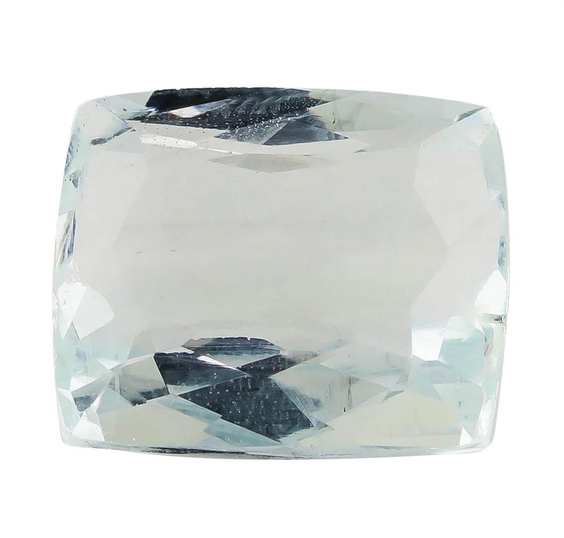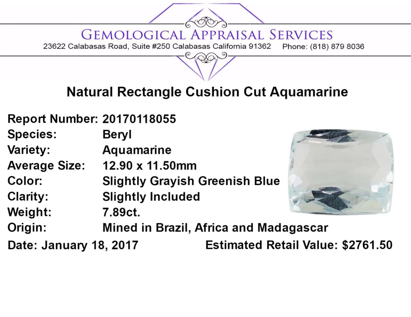 One natural rectangle cushion cut aquamarine with an exact weight of 7.89ct., clarity is slightly included, slightly grayish greenish blue. Gemological Appraisals Services estimates the retail value at $2761.5 GAS Appraised.