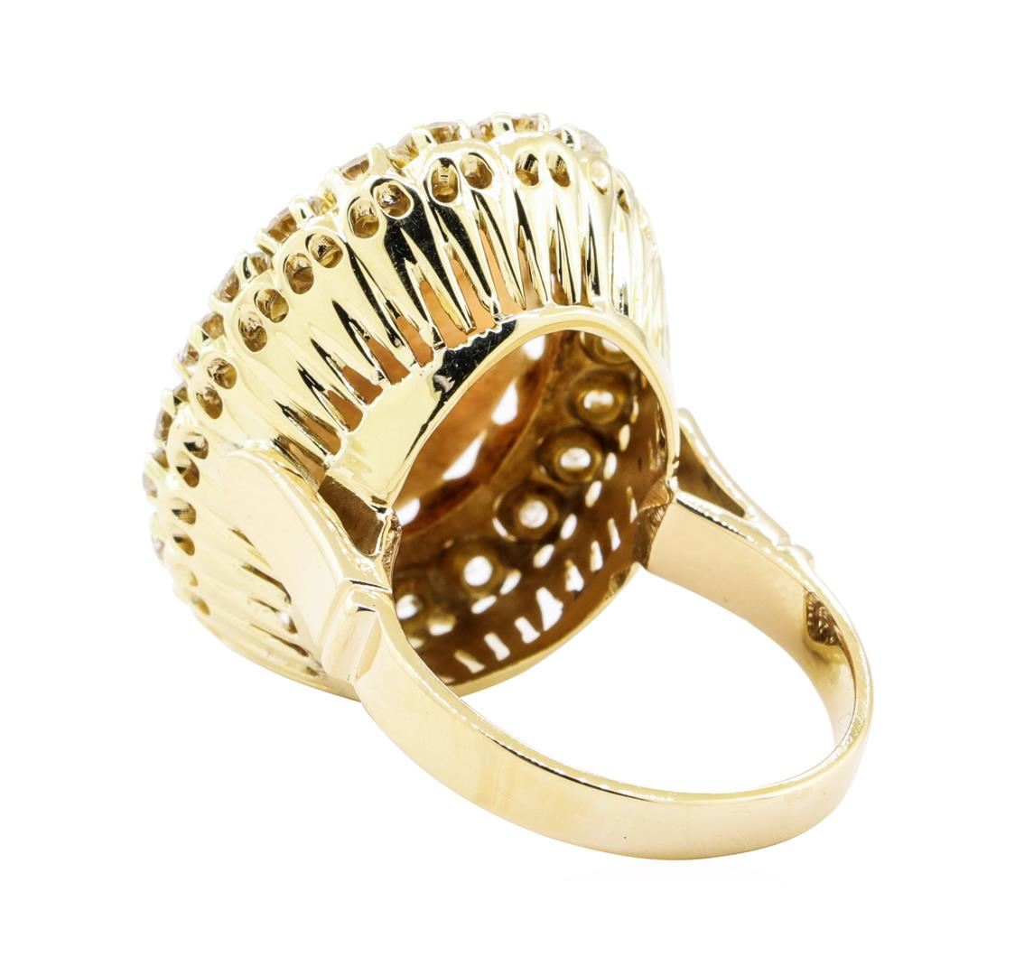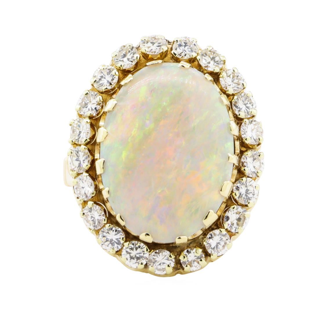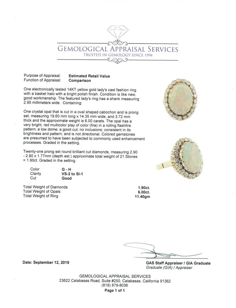 One electronically tested 14KT yellow gold lady's cast fashion ring with a basket halo with a bright polish finish. The featured lady's ring has a shank measuring 2.95 millimeters wide. Condition is Good. Containing: One crystal opal that is cut in a oval shaped cabochon and is prong set, measuring 19.60 mm long x 14.35 mm wide, and 3.72 mm thick and the approximate weight is 6.00 carats. The opal has a very bright, red multicolor play of color (fire) in a rolling flashfire pattern; a low dome; a good cut; no inclusions; consistent in its brightness and pattern; and is not directional. Colored gemstones are presumed to have been subjected to commonly used enhancement processes. Graded in the setting. Twenty-One prong set round brilliant cut diamonds, measuring 2.90 - 2.80 x 1.77mm (depth est.) approximate total weight of 21 Stones = 1.90ct. Graded in the setting. Color G - H Clarity VS-2 to SI-1 Cut Good. Total Weight of Diamonds 1.90ct.. Total Weight of Opals 6.00ct.. Total Weight of Ring 11.40gm GAS Appraised at $9825.00. GAS Appraised at $9,825.00.