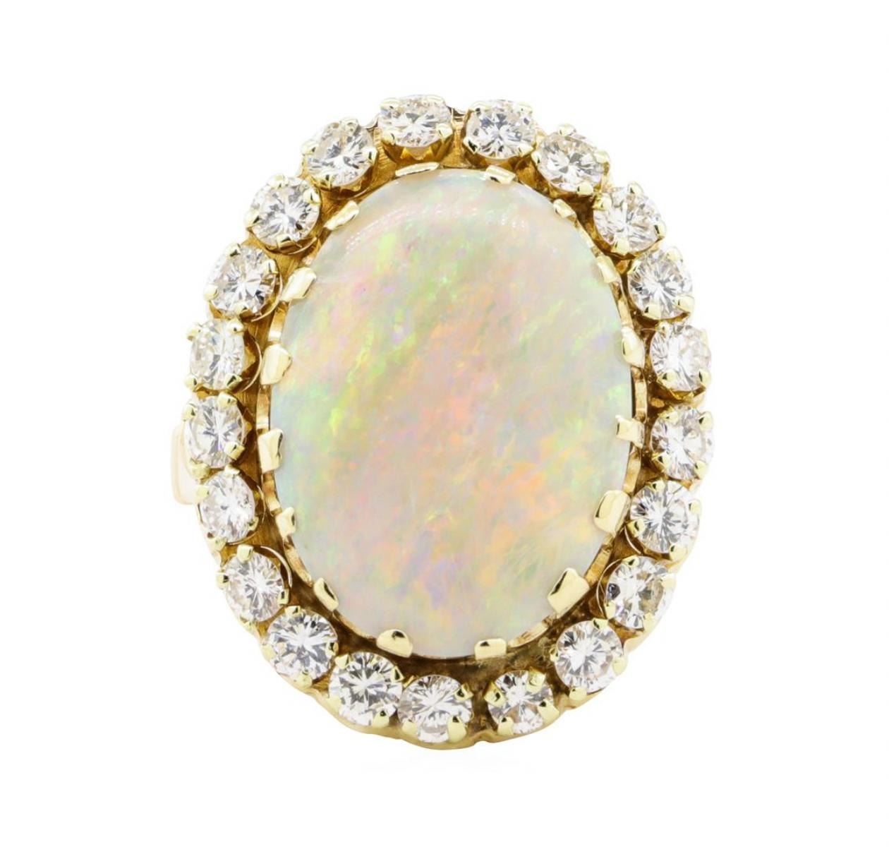 One electronically tested 14KT yellow gold lady's cast fashion ring with a basket halo with a bright polish finish. The featured lady's ring has a shank measuring 2.95 millimeters wide. Condition is Good. Containing: One crystal opal that is cut in a oval shaped cabochon and is prong set, measuring 19.60 mm long x 14.35 mm wide, and 3.72 mm thick and the approximate weight is 6.00 carats. The opal has a very bright, red multicolor play of color (fire) in a rolling flashfire pattern; a low dome; a good cut; no inclusions; consistent in its brightness and pattern; and is not directional. Colored gemstones are presumed to have been subjected to commonly used enhancement processes. Graded in the setting. Twenty-One prong set round brilliant cut diamonds, measuring 2.90 - 2.80 x 1.77mm (depth est.) approximate total weight of 21 Stones = 1.90ct. Graded in the setting. Color G - H Clarity VS-2 to SI-1 Cut Good. Total Weight of Diamonds 1.90ct.. Total Weight of Opals 6.00ct.. Total Weight of Ring 11.40gm GAS Appraised at $9825.00. GAS Appraised.