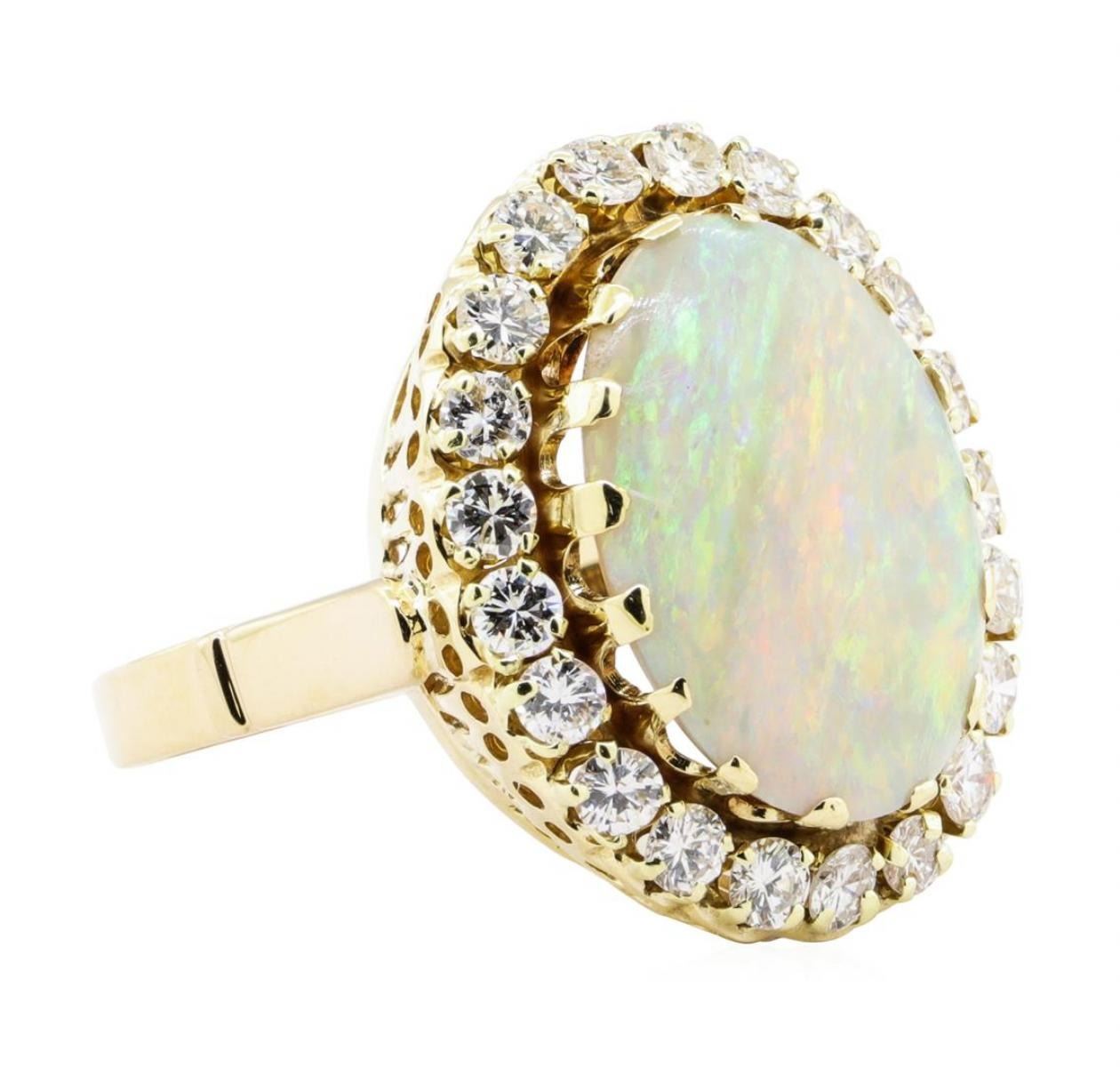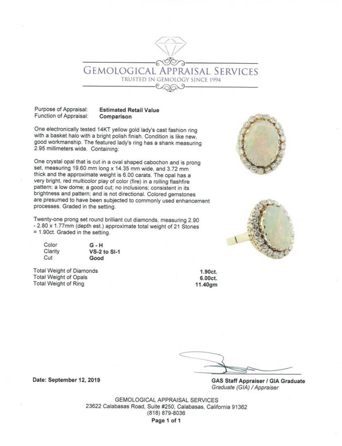 One electronically tested 14KT yellow gold lady's cast fashion ring with a basket halo with a bright polish finish. The featured lady's ring has a shank measuring 2.95 millimeters wide. Condition is Good. Containing: One crystal opal that is cut in a oval shaped cabochon and is prong set, measuring 19.60 mm long x 14.35 mm wide, and 3.72 mm thick and the approximate weight is 6.00 carats. The opal has a very bright, red multicolor play of color (fire) in a rolling flashfire pattern; a low dome; a good cut; no inclusions; consistent in its brightness and pattern; and is not directional. Colored gemstones are presumed to have been subjected to commonly used enhancement processes. Graded in the setting. Twenty-One prong set round brilliant cut diamonds, measuring 2.90 - 2.80 x 1.77mm (depth est.) approximate total weight of 21 Stones = 1.90ct. Graded in the setting. Color G - H Clarity VS-2 to SI-1 Cut Good. Total Weight of Diamonds 1.90ct.. Total Weight of Opals 6.00ct.. Total Weight of Ring 11.40gm GAS Appraised at $9825.00. GAS Appraised.