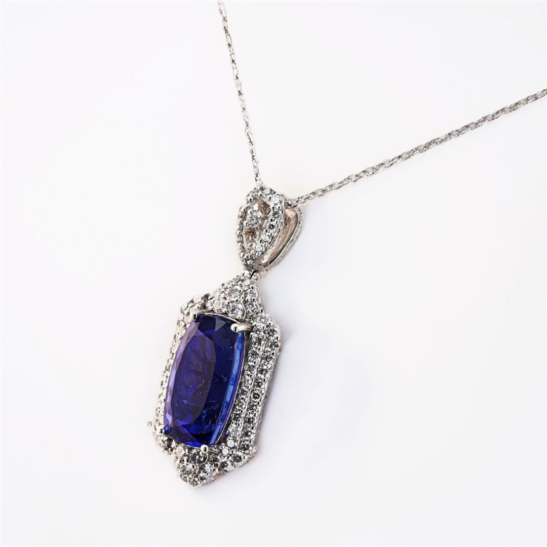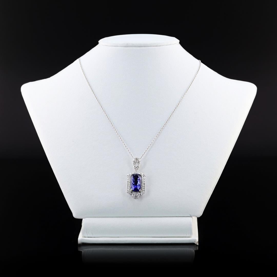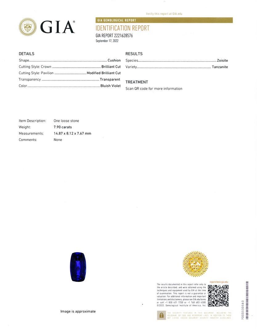 7.90ct Tanzanite and 0.95ctw Diamond Platinum Pendant (GIA CERTIFIED). One polished, stamped, and tested platinum Oscar Friedman pendant mounted with: 1 genuine GIA certified tanzanite center stone weighing 7.90 carats, and 83 genuine round diamonds weighing approximately 0.95 carats. The pendant hangs from a platinum link chain measuring 18 inches in length. This item weighs 11.2 grams, condition is new, excellent workmanship. MAIN GEMSTONE GIA Report No.: 2221628576 Species: Zoisite Variety: Tanzanite Shape: Cushion Cutting Style: Brilliant Cut Crown Modified Brilliant Cut Pavilion Measurements: 14.87 x 8.12 x 7.67mm Weight: 7.90 carats Color: Bluish Violet Transparency: Transparent Refractive Index: 1.691 - 1.700 DR Birefringence: 0.008 - 0.013 Hardness: 6.5 - 7 ADJACENT GEMSTONES ON PENDANT Identity: Natural Diamond Shape: Round Cutting Style: Brilliant Cut Quantity: 83 Diamonds Measurements: 1.0 - 1.7mm Total Weight: 0.95 carats Clarity Grade: VS2 - SI1 Color Grade: G - H Refractive Index: 2.417 Hardness: 10 TANZANITE WEIGHT: 7.90 ct TOTAL DIAMOND WEIGHT: 0.95 cts WEIGHT OF ITEM: 11.2 grams METAL: Platinum