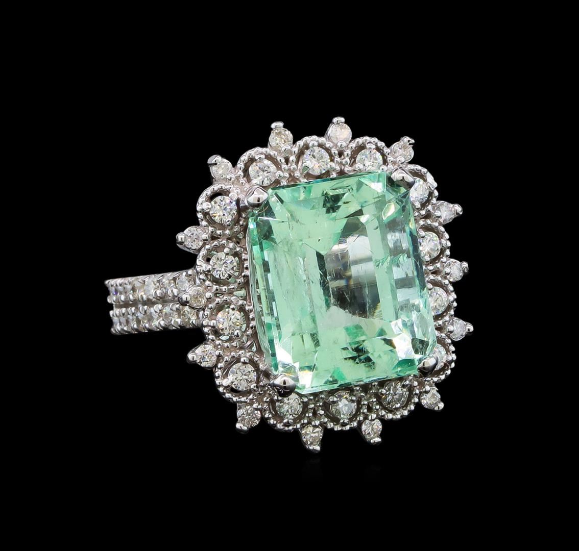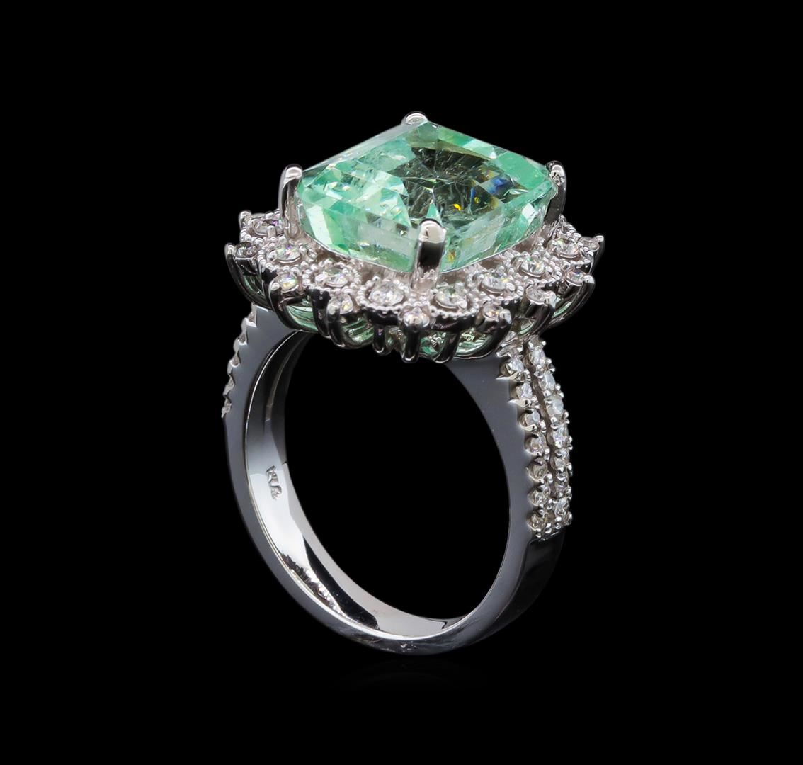 One electronically tested 14KT white gold lady's cast fashion ring with a scalloped basket halo with a bright polish with milgrain detailing finish. The featured lady's ring has a shank measuring 3.36 millimeters wide. Identified with markings of '14K'. Condition is new, good workmanship. Containing: One prong set emerald standard step cut natural emerald, measuring 12.41 x 10.26 x 8.26mm, (depth est.) 2%. bulge factor, approximate weight of 7.91ct., clarity is slightly included, light, moderately strong, green color, (GIA G 3/4), cut is very good. Transmitting light with a minimum of distortion, transparent. Naturally occurring internal & external characteristics are present. Indications of oil residue. Colored gemstones are presumed to have been subjected to commonly used enhancement processes. Graded in the setting. Forty-Two prong set round brilliant cut diamonds, measuring 1.50 - 1.40 x 0.90mm (depth est.) approximate total weight of 42 Stones = 0.49ct. Graded in the setting. Clarity SI-1 to I-1. Color: H - I Cut Good Fourteen prong set round brilliant cut diamonds, measuring 1.30 - 1.25 x 0.79mm (depth est.) approximate total weight of 14 Stones = 0.11ct. Graded in the setting. Clarity SI-1 to I-1. Color: H - I Cut Good. Total Weight of Colored Stones 7.91ct.. Total Weight of Diamonds 0.60ct.. Total Weight of Ring 9.30gm. GAS Appraised at $11,030.00.