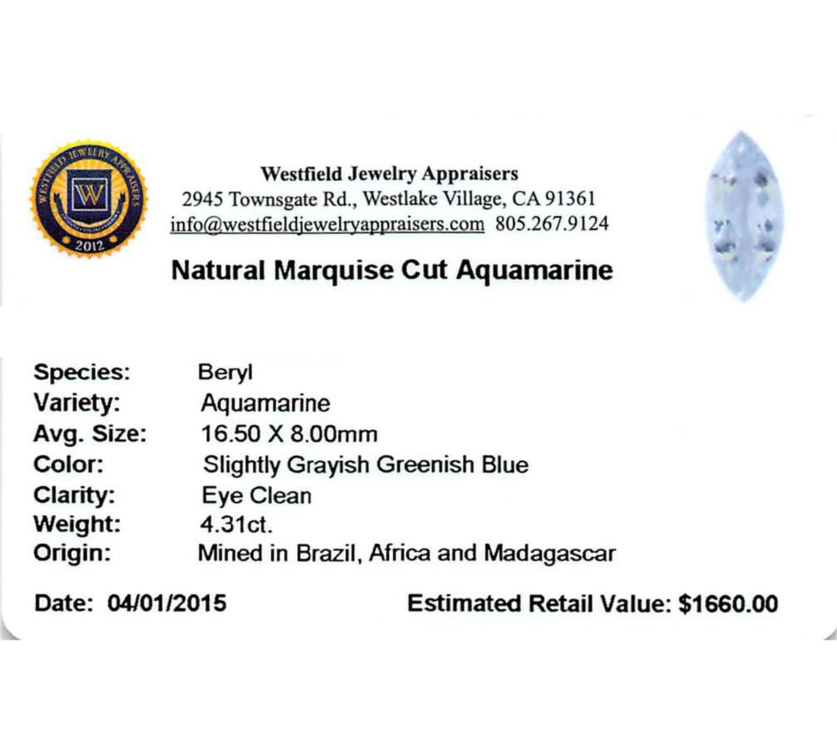 One pear cut natural aquamarine exact weight 7.91ct., clarity is slightly included, type I, medium, slightly grayish, very slightly greenish blue color, (GIA vslgB 5/2), cut is good. Westfield Appraised at $3,045.00.