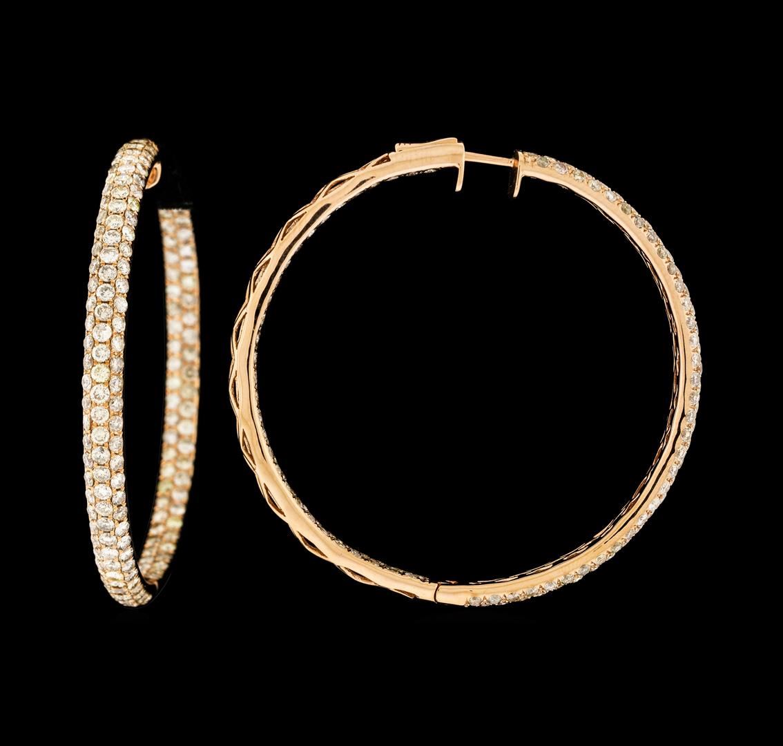 One pair electronically tested 14KT rose gold lady's combination cast & assembled diamond inside out hoop earrings with hinged, snap locking posts with a bright polish finish. The featured lady's earrings have a diameter of approximately 50 millimeters. Trademark is MICHA. Identified with markings of '14K 585'. Condition is new, good workmanship. Containing: Three Hundred Twenty-Four prong set round brilliant cut diamonds, measuring 1.90 - 1.80 x 1.15mm (depth est.) approximate total weight of 324 Stones = 7.92ct. Graded in the setting. Clarity SI-1 to SI-3. Color: H - I Cut Good. Total Weight of Diamonds 7.92ct.. Total Weight of Earrings 17.90gm. GAS Appraised at $18,075.00.
